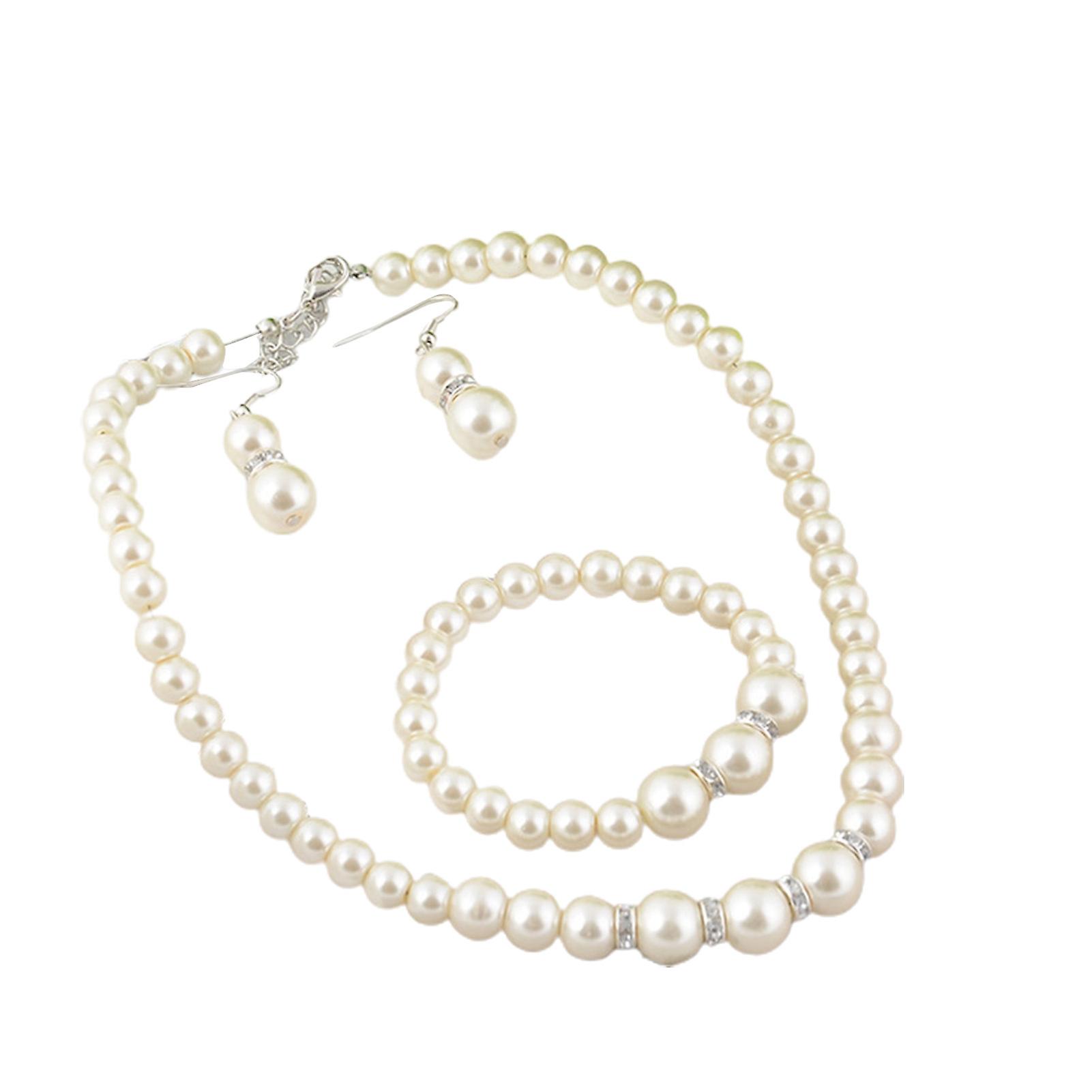 Description: Imitation pearl design gives a stylish and elegant look. Elastic bracelet design makes it fit your wrist while not feeling too tight. Shiny rhinestone design makes you become eye-catching at the party. It can be worn for weddings, engagement, graduation, cosplay, prom, etc. Made of quality imitation pearl material, the jewelry set is beautiful. A set includes various type. It is suitable for wedding, engagement, graduation, cosplay, prom, etc. Item Name: Jewelry Set Material: Imitation Pearl Style: Fashion Gender: Women Features: Imitation Pearl, Lightweight, Elastic Bracelet Size Details: Necklace Length: 45cm/17.73" (Approx.) Earrings Length: 4cm/1.58" (Approx.) Earrings Width: 1cm/0.39" (Approx.) Bracelet Length: 18cm/7.09" (Approx.) Notes: Due to the light and screen setting difference, the item's color may be slightly different from the pictures. Please allow slight dimension difference due to different manual measurement. Package Includes: 1 x Necklace 1 x Bracelet 1 Pair of Earrings
