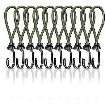 10 short rubber bands with hooks. 15cm tarpaulin tensioners with spiral hook loop.