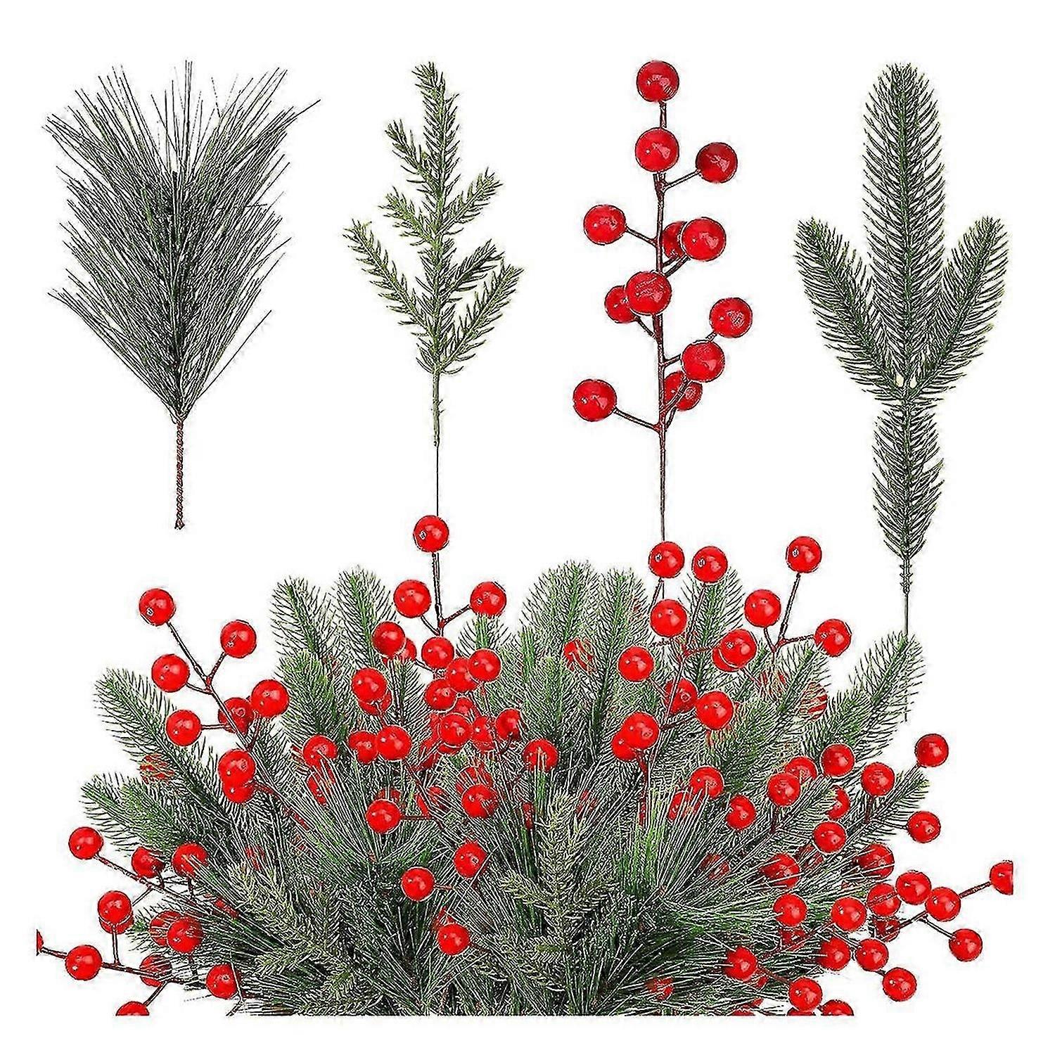 100Pc Artificial Pine Needles Branches and Artificial Red Berry Stems