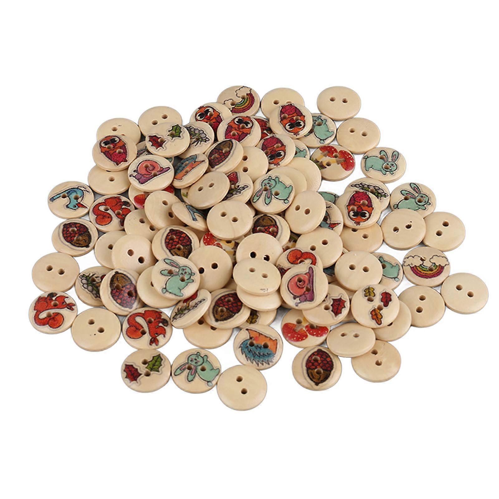 100pcs Mixed Printing Wooden Buttons 2 Holes Round Decorative Wooden Buttons for Sewing Craft Log Color Cartoon Forest Animals