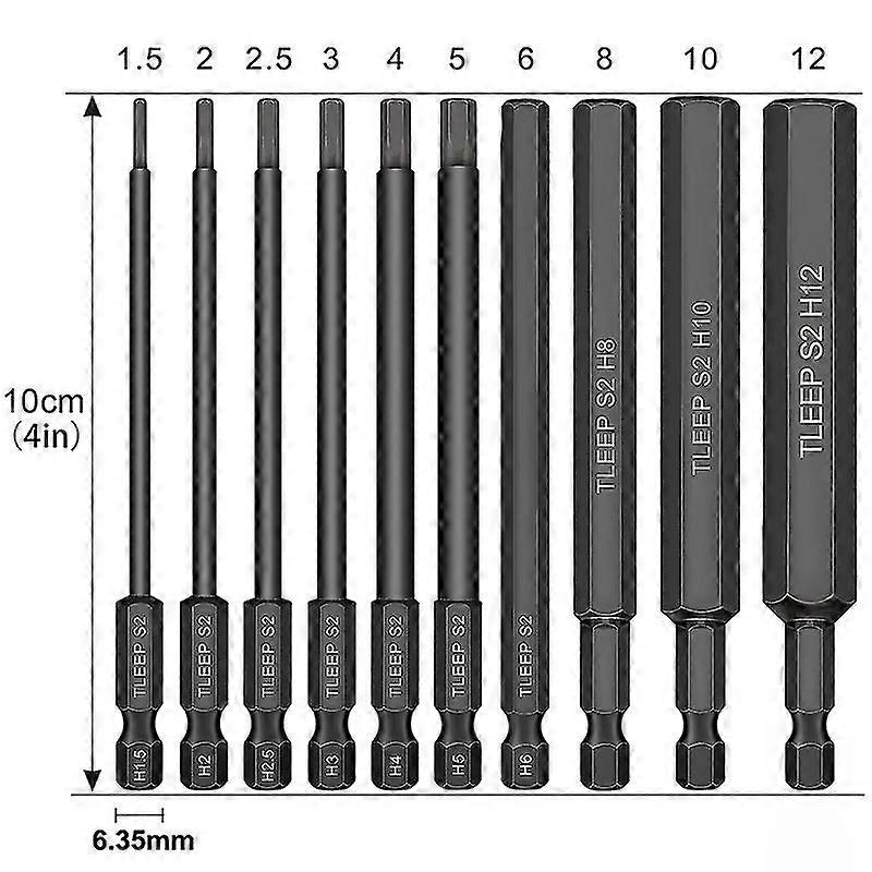 10pcs Hex Head Allen Wrench Drill Bits Set 100mm Long SAE Metric Allen Screwdriver Bits Magnetic Tip Hex Key Screwdriver Socket Bit Set(1.5mm-12mm) Item Name:Allen Screwdriver Bits Material: S2 Steel Color:Black Shank:1/4 Inch Hex(6.35mm) Length: 100 mm Quantity & Size: 10pcs 100mm Metric Hex Head Allen Bit Size: 1.5mm,2mm,2.5mm,3mm,4mm,5mm,6mm,8mm,10mm,12mm 10pcs 100mm SAE Hex Head Allen Bit Size: 5/64", 3/32", 7/64", 1/8", 9/64", 5/32", 3/16", 7/32", 1/4", 5/16" 8pcs 50mm Inner Hex Head Allen Bit Size: 1.5mm,2mm,2.5mm,3mm,4mm,5mm,6mm,8mm. Feature 1. High QualityHeat treated, durability, has high hardne, not easy to wear. PLEASE MAKE SURE YOU CHOOSE THE RIGHT DRILL BIT AND CONTROL THE RIGHT SPEED OF THE DRILL. THIS OPERATION GREATLY PROLONGS THE SERVICE LIFE OF THE HEX DRILL BITS. 2. Profeional Hex Bit Set Are Made of S2 Alloy Steel, Very Well Made And Tough As Nails - Hardne can reach HRC60 degree. Hex key set fit for electric drills with speed regulating device, electric screwdrivers, hand screwdrivers.Please do not use drill bits on pneumatic tools, air dills, and the electric drill without speed regulation. A long lifetime of the drill bit is reached due to its durable construction and superior technology. 3. Nickel Plating Surface Treatment, Super Anti-Rust High quality, long lasting and durable. The Hex drill bit set is clearly marked that you can find what size you need quickly.Easy to take and use. 4. Magnetic Tips And 100mm Length - The hex allen screwdriver set is a little bit magnetic, which helps to keep nuts and bolts stuck to them. Can improve your work efficiency. Thumbs up! 100mm(3.94") length, longer than the market ones, More practical and convenient. Packing Includes 8pcs/10pcs x Hex head allen bits Detail Shows