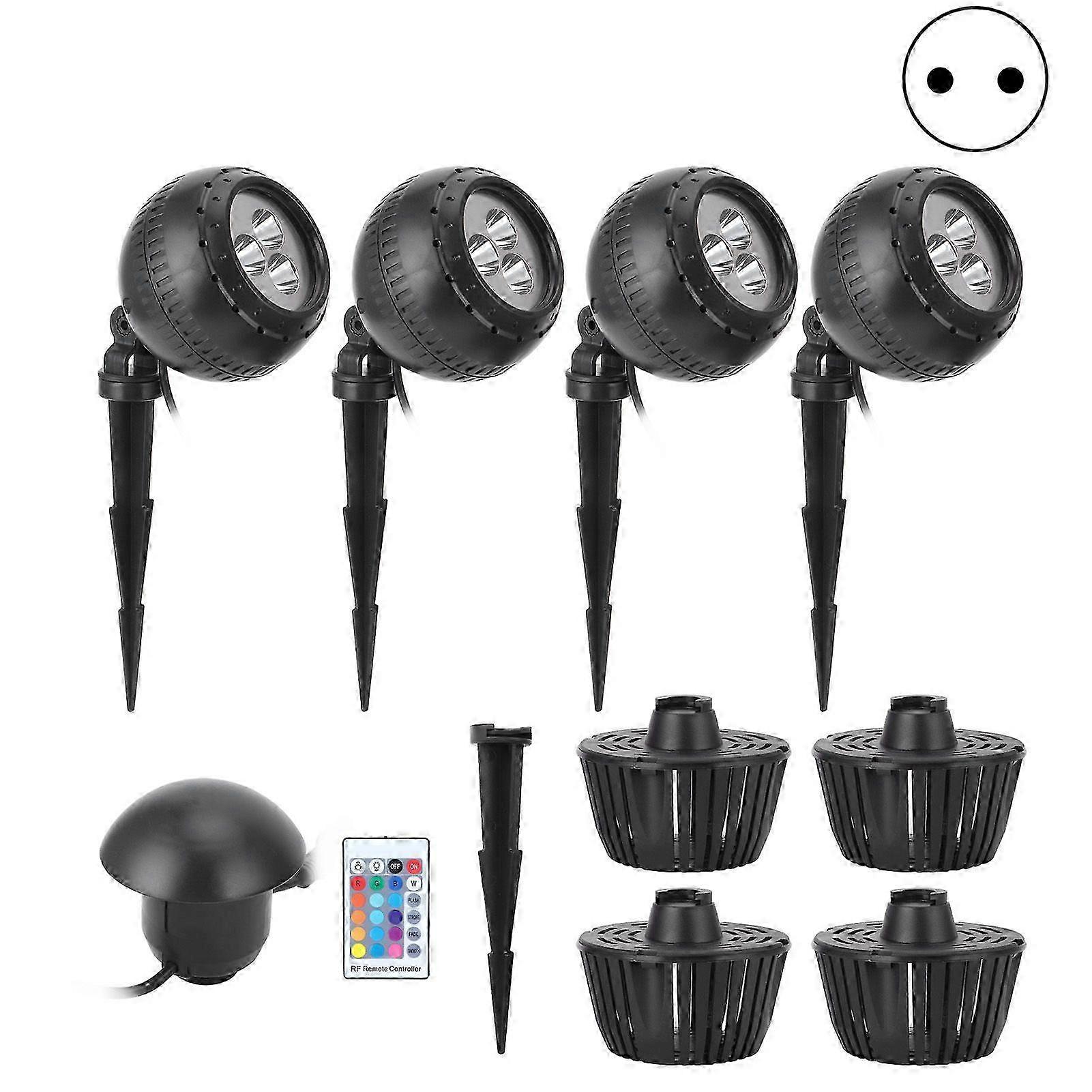 Feature:1. A set of 4 10W RGB pond lights with plugs, totaling 980LM. Its chip is brighter and more stable than standard chips, and brighter than solar garden lights.2. Remote control 20 kinds of static lighting effects and 4 kinds of dynamic effects. You can adjust the brightness of the static effect and the speed of the dynamic effect, so you can easily control the on or off of the landscape light, set the color and lighting mode.3. The LED underwater light requires a low working voltage of 12V, which will not cause danger to people and fish, and is safe and reliable.4. With low voltage, its power consumption is reduced and its brightness is super high, but it can operate at low temperatures.5. The method of use is simple, just plug in the power supply and use it, which is practical and convenient.Specification:Item Type: Underwater LightMaterial: ABSWeight: Approx. 1626g or 57.4ozLight Body Size: Approx. 9x12cm or 3.5x4.7inInput Voltage: AC 100-240VOutput Voltage: DC 12VPower Per Lamp: 2.5WWaterproof Rating: IP68Light Color: RGBPower Cord Length: Approx. 0.45m or 1.5ftController Cable Length: Approx. 5m or 16.4ftLight Source: 5050 RGB SMDNumber of LEDs: 3Pcs or lamp, 12Pcs in totalEffective Life: 30000 hoursWorking Temperature: -4F-104FThe remote control is shipped with batteriesBattery Type: button batteryBattery Model: CR2025Battery Capacity: 150mAhNumber of Battery: 1How to Use:It can be used when it is connected to the power supply. You can use the remote control to change the color and pattern according to your own preferences or mood..Package List:1 x EU Plug Power Supply4 x Garden Light1 x Controller with a Cable Length of 5m1 x RF Controller1 x 1 to 4 Distributor5 x Ground Thorn4 x Diving Base4 x Lampshade1 x Manual