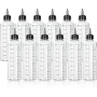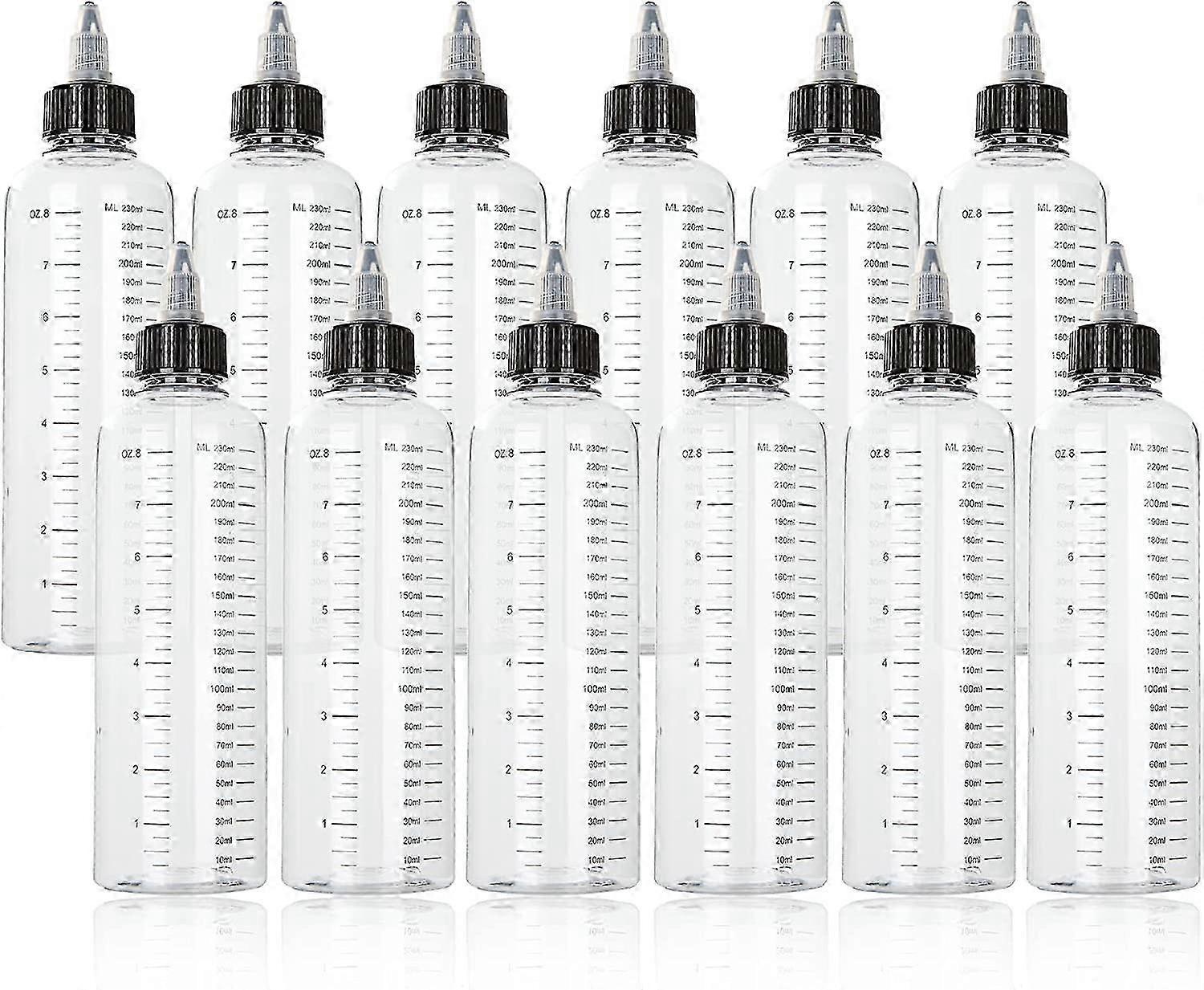 12 pcs plastic graduated distribution bottles 250ml with black twist cap, squeeze vials featuring measurement scale for various uses