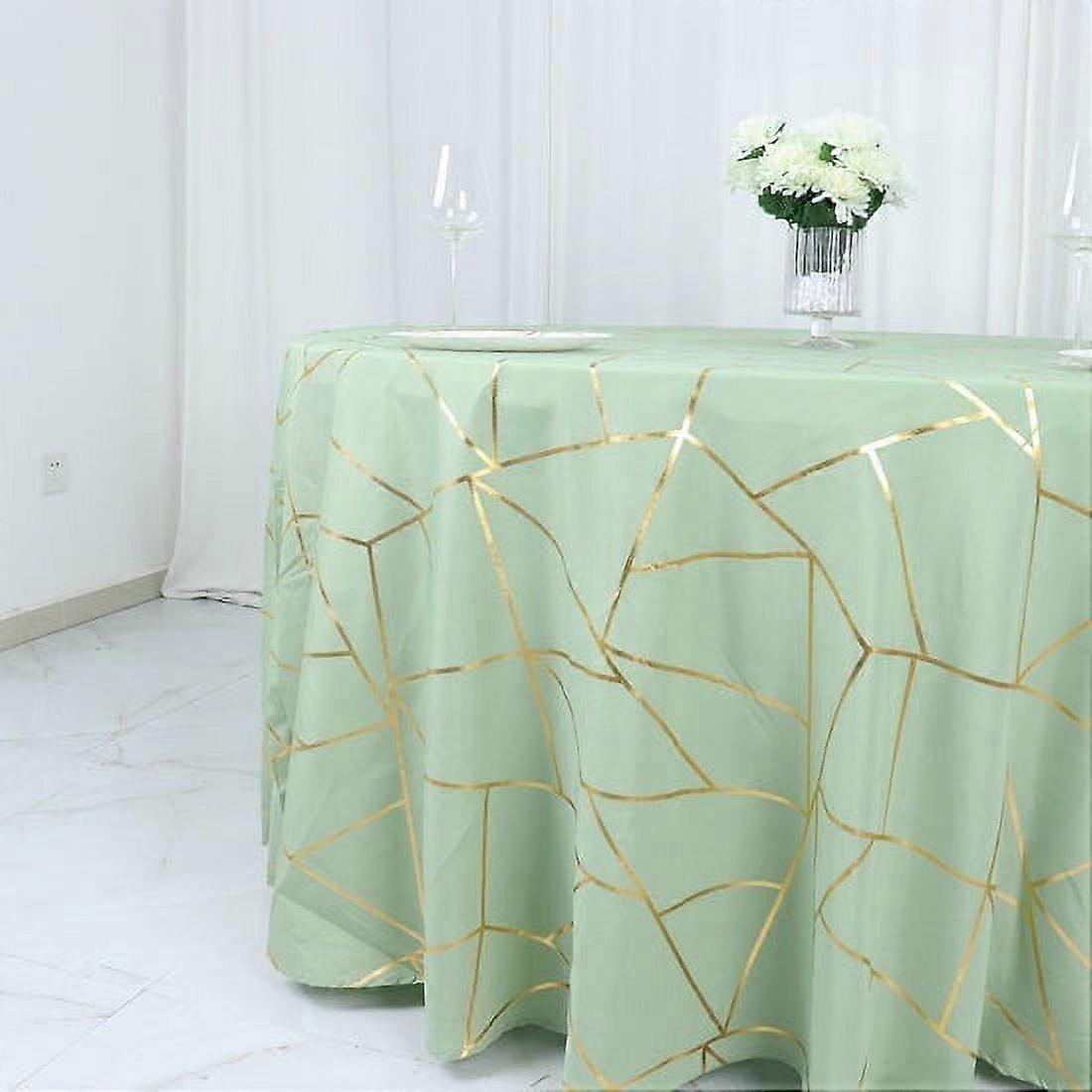 120" Sage Green Round Polyester Tablecloth With Gold Foil Geometric Pattern