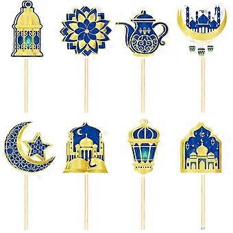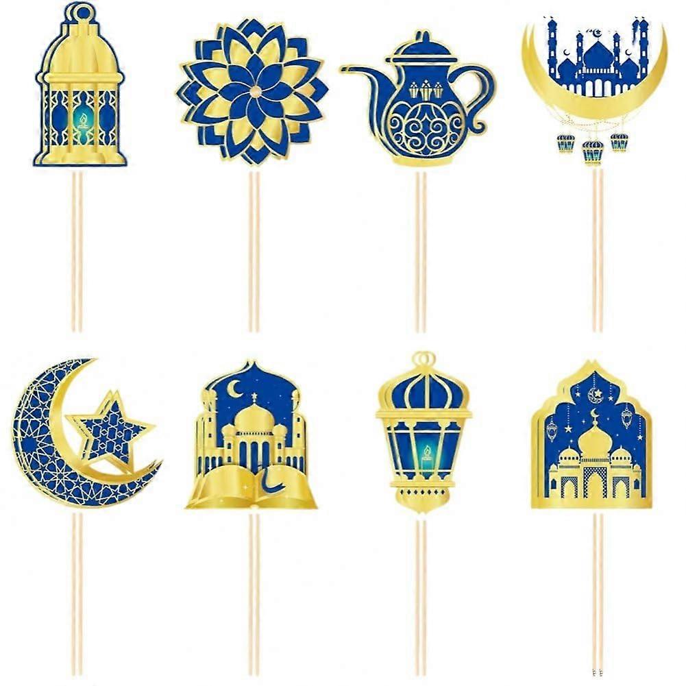 16个开斋节快乐蛋糕装饰顶插,斋月月亮清真寺蛋糕甜点装饰顶插DIY装饰伊斯兰穆斯林节日蛋糕顶插派对用品蓝金色