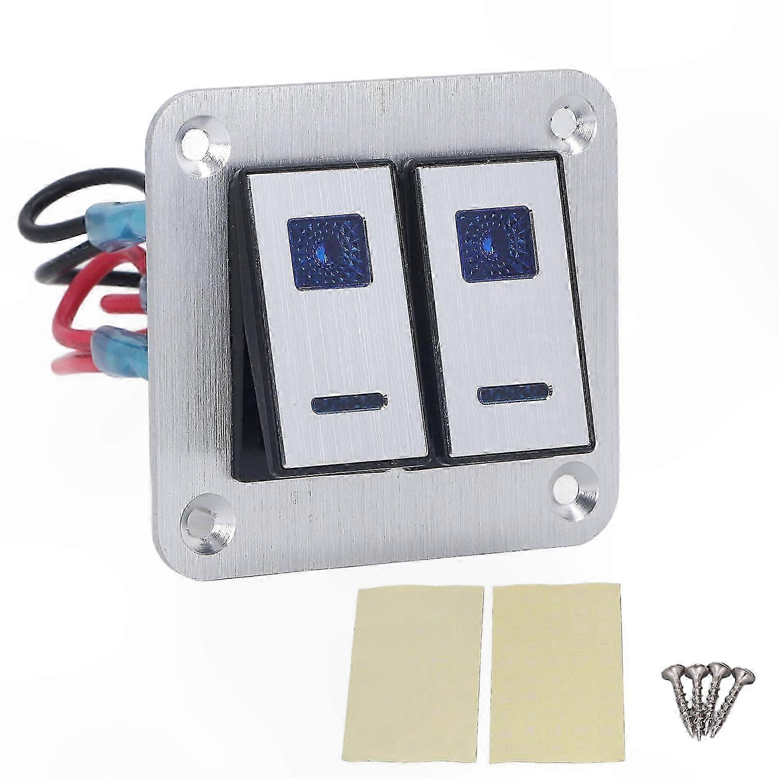 2 Gang Rocker Switch Panel with Blue LED Light for Car, RV, Yacht - Waterproof Silver Oxide Surface On/Off Toggle Modification Panel