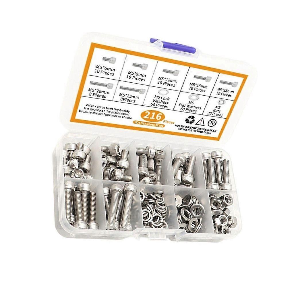Features: Make from 304 stainless steel materials, highly strength, corrosion and antirust, not easy to break. Thread is tight and force is uniform, it is not easy to deforms and slide during rolling and installation, it can bear greater loads, and it can ensure the stability of the installation. Hexagon nuts can make your installation more precise and fastens better, providing strong holding force and clamping force; washers can increase the contact area, distribute pressure, protect the nuts and bolts, and prolongs the use time. Widely used in household appliances, automobile assembly, product manufacturing, precisions machinery industry, electronic products, communication products, lamp, toy, maintenance and other fields. All key screws is stored in a clear storage box with compartments, is well organized, easy to carry and find. Specifications: Material: 304 stainless steel Box size: about 13x8x2cm/5.12x3.15x0.79inch Note: Please allow 1-2cm errors due to manual measurement, make sure that you do not mind before you order. Due to difference between different monitors, the picture may not reflect the actual color. Package includes: 10Pcs 5x6mm 10Pcs 5x8mm 10Pcs 5x12mm 10Pcs 5x16mm 10Pcs 5x18mm 8pcs 5x20mm 8pcs 5x25mm 60Pcs 5mm Lock Washer 60Pcs 5mm Flat Washer 30Pcs 5mm Nuts