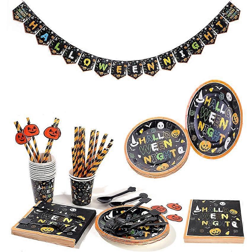 24 Person Set Halloween Party Decoration Tableware Set Tablecloth Paper Plate Banner Without Straw 1. 7-inch plate 24 pcs a pack 183g, diameter 18cm 2. 9-inch plate 24 pcs. 285g, 23cm in diameter 3. 24 pieces of 9oz paper cup 116g, diameter 7.5cm, height 2.05cm 4. Double-layer tissues, 24 pieces per pack, 98g, size 16.5x16.5 (expanded 33cm) 5. A strip of 106g with 15 sides of banner, size 16x20cm 6. Small tablecloth 48g, size 108-180cm 7. Large tablecloth 80g, size 130-220cm 8. 24 knives, 83g, size 17cm 9. 24 forks 90g, size 15.5 cm 10. 24 spoons 88g, size 15.3 cm 11. Include accessories: 7-inch plate x24, 9-inch plate x24, paper cup x24, paper towel x24, knife x24, fork x24, spoon x24, large tablecloth x1, letter pull flag x1 (without straw)