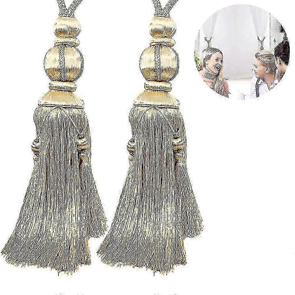 Product Ball length plus tassel: approx. 30 cm / 11.81 inchesTotal length: approx. 75 cmTechnique: hand knittingMaterial: plush, polyester fiberColor: beige, gold, silver grayChecklist: 2 * curtain belt hanging ball1.Especially The unique lantern tassel curtain buckle, luxury style,fashion and elegant. Made of premium plush & polyester fibre, totally handcrafted braided, creating gorgeous atmosphere for your room. It is suitable for medium thick, thin string curtain, gauze shade curtain, especial for countryside floral curtain, etc.2.HAND KNITTINGAdopting concise and exquisite model and fine workmanship of hand knitting to make it look more advanced. Cinch up drapes and curtains with a uniquely stylish flair and give your living area a sense of style.3.EASY TO USE1 pair of tiebacks, multiple useful occasion, no tools required and zero assembly. You can directly tied in curtains or use with hook. It is very easy to use the curtain cord to decorate the curtain. Deluxe Curtain ornament for Hall, Lobby, Living Room, Bedroom.4.SIZE & COLOR Length of ball plus tassel: about 30 cm/ 11.81 inches & Total length: about 75 cm/ 29.53 inches. And the tassel is long enough .They are very chic and elegant for your curtain decoration. 3 Color Option: Gold, Beige, Silver Gray.5.NOTESDon't unlock the knot at the middle of binding rope hanging ball, or it will be very difficult to bind up if you are not professional.