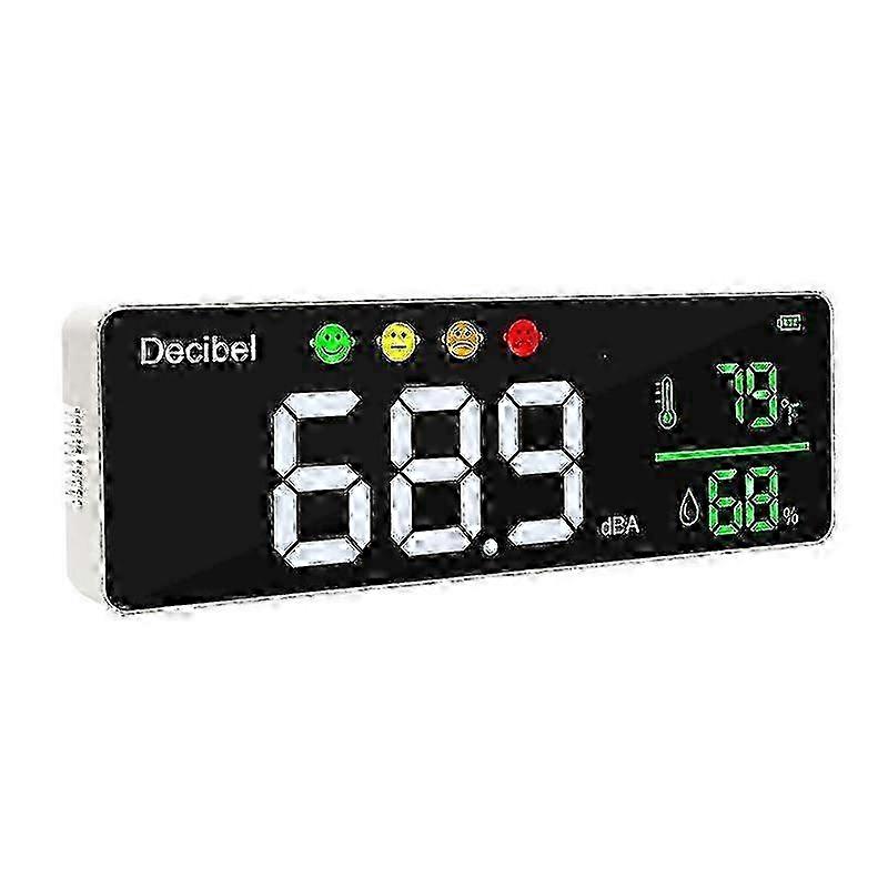 Usage Tips:Features: AUTO Alarm Icons: the noise alarm face icon will automatically switch when the decibel at different level. [Green Icon]Less than 60dB [Yellow Icon]60-75dB [Orange Icon]75-85dB [Red Icon]More than 85dB High Accuracy:Decibel Level Measuring Range: 30-130dB , Accuracy: ±1.5dB Frequency response range: 50Hz -8.5KHz Temperature Range: 14-140°F Humidity Range: 20-85 percent EXTRA LARGE LCD DISPLAY and WALL MOUNT: Our digital sound level meter is equipped with a high-definition backlit LCD screen, so that you can effortlessly read it throughout the day at your convenience. Unlike handheld sound level meters, our premium wall-mountable dB meter is simple to set up and perfect for continuous monitoring. VERSATILE and LONG-LASTING: Our classroom noise meter can be used all over your space. It's wall mountable with a 10ft power cord, flat-bottomed for placing on tables, and lasts for hours unplugged with a 2000MaH battery. Also, it can be a home theater SPL meter by the TV or in your garage workshop. BONUS FEATURES: We've included bonus HUMIDITY and TEMPERATURE readings in addition to bringing you the best decibel meter we could. And to top it off, the sound level tester has 3 ADJUSTABLE SPEEDS (1. Fast 2. Medium 3. Slow) to make reading it a breeze. Color: As Shown Material: ABS Package Contents: 1X Decibel Meter 1X Mounting accessories 1X USB charging cable 1X English Manual Only the above package content, other products are not included. Note: Light reflection and different displays may cause the color of the item in the picture a little different from the real thing. The measurement allowed error is 1-3cm.