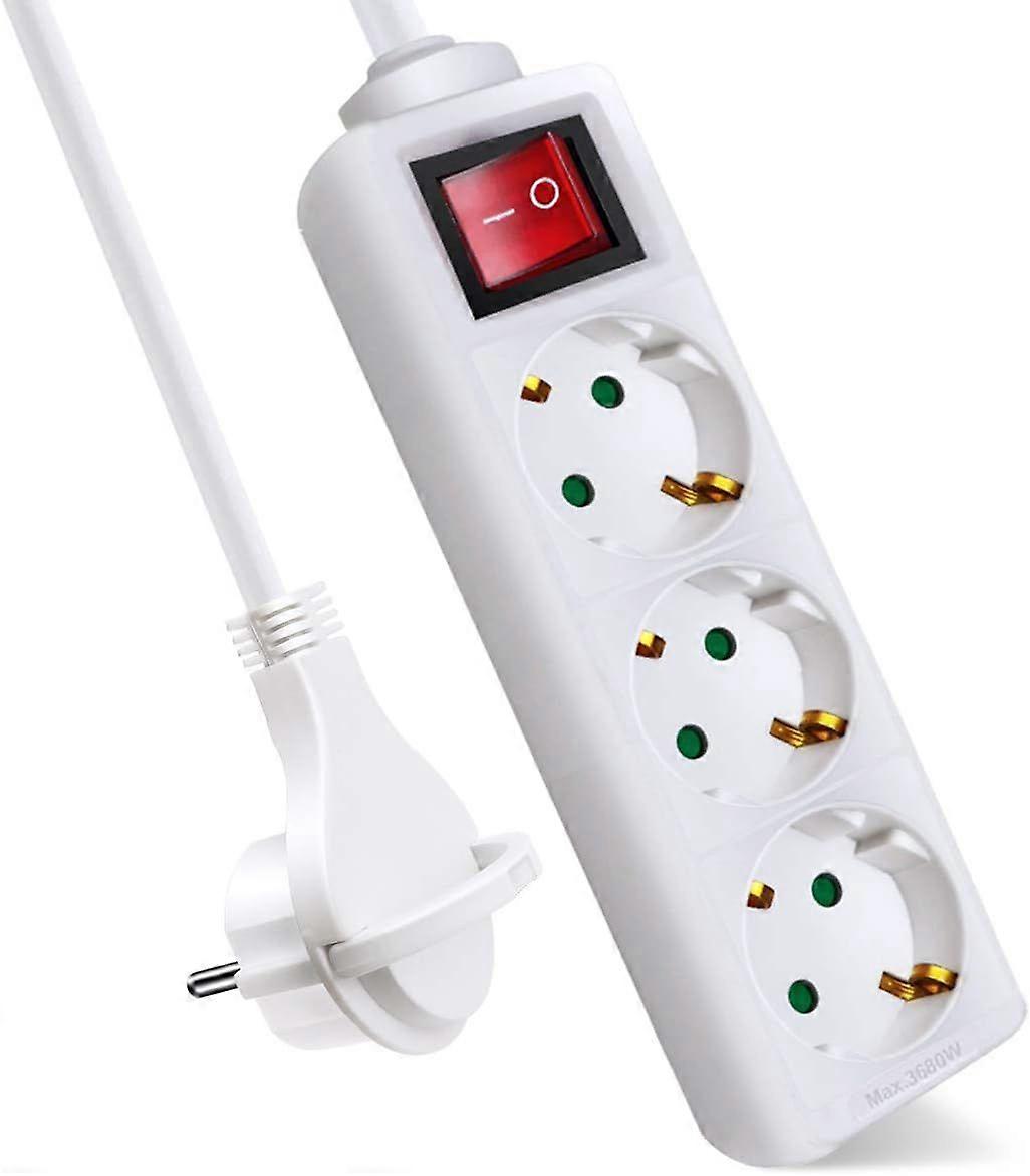 Multiple socket: 4-way power strip with 45 Schuko plug. 3G1.5mm/3m cable. Max. 3680 watts; Current: Max. 16A; Power supply: 230-250 V; Material: PP (heat and shock resistant); Cable length: 3m New design: Ultra-wide space and flat plugs. Furniture can be pushed completely against the wall. Ultra-flat plugs can be used in hard-to-reach or narrow spaces. Folding tabs make it easier to remove the plug from the socket. Best protection: On/off switch with built-in circuit breaker with red LED. Turn off the device when not in use. And child protection (safety lock in each socket) Wide application: Multiple socket is especially safe at home and at work. Ideal for the office, at home, or at school.