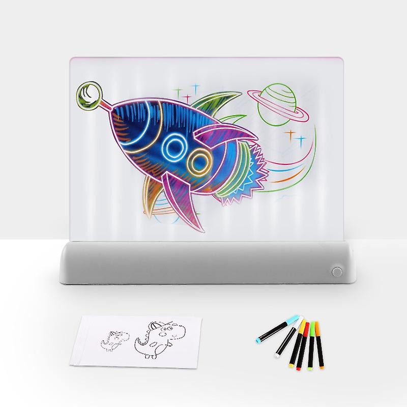 3D Painting orescent Plate 1. Voltage: 4.5V 2. Working current: 0.88A 3. Light source: LED/RGB 4. Power supply mode: 3 AA batteries (not included) 5. Applicable age: children over 3 years old 6. Scope of application: gifts, 3D magic drawing boards, childrens educational toys, party atmosphere lights, store displays, etc. 7. Packing list: drawing board x1, manual x1, color highlighter x6, wipe board x1, copy drawing x 58. Size: about 32x24x5 cm 9. Light emitting area: about 30x20 cm 10. Weight: about 417 gramsInstructions 1. Open the battery cover and install three AA batteries 2. Tear off the protective film on the light guide plate, and then draw on the light guide plate with a colored highlighter 3. Insert the light guide plate into the LED base after drawing 4. Turn on the power switch and adjust to a suitable light color