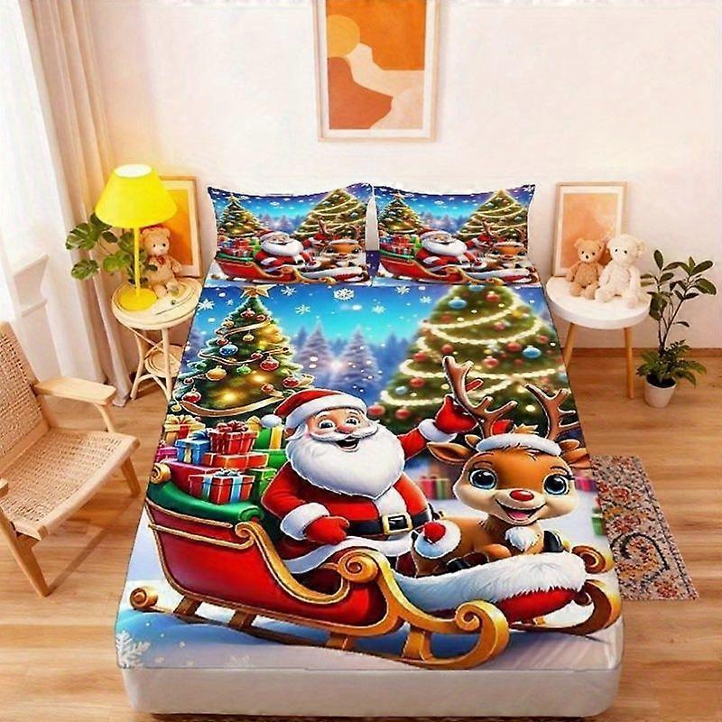 3pcs Christmas Poster Fitted Sheet - 1 Bed Sheet + 2 Pillowcases Set Stylish Design Pattern