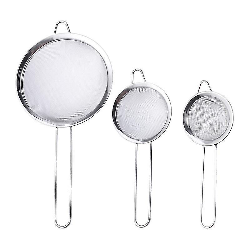 Feature - Color: Silvery. - Material: Stainless steel. - Size: About 8cm Diameter + 10cm Diameter + 18cm Diameter. - Excellent for sifting dry ingredients. - You can stack or these mesh strainers in the kitchen. - It is useful kitchen tool which can help you make delicious treats.