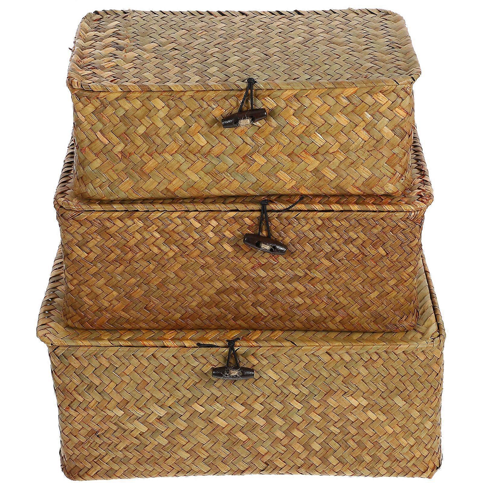 3pcs New Seaweed With Button Woven Basket Straw Woven Debris Desktop Storage Box Hand-woven Storage Basket - Size S, M, L