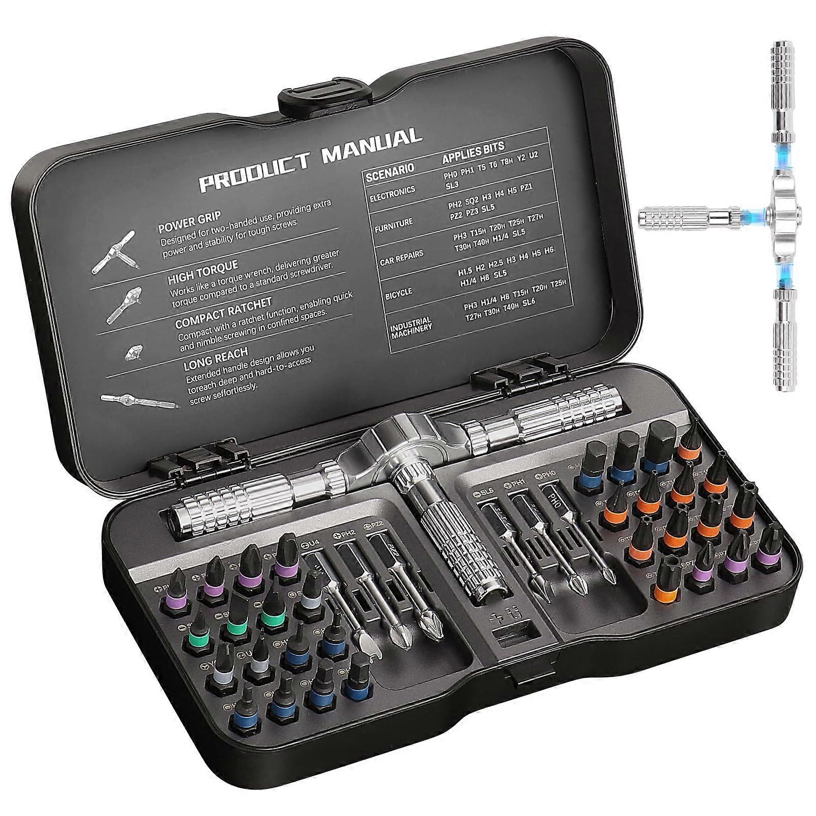 40in1 Magnetic Ratchet Screwdriver Set Upgrade your toolkit with a versatile screwdriver set designed to tackle repairs with speed, precision, and comfort. for professionals and DIY users alike, this set is engineered for efficiency in tight spaces and complex angles. Key Features and Benefits: Flexible Ratchet Handle Design The detachable ratchet handle easily converts into straight, Tshape, or Lshape configurations, allowing you to reach awkward spaces or work at challenging angles. Ergonomic antislip aluminum grip ensures comfortable handling during extended use while maintaining accurate torque control. EffortSaving Ratchet Mechanism Equipped with a 58tooth forward and reverse ratcheting system, providing smooth torque transfer while reducing wrist strain. Saves up to 80 percent of effort compared to traditional screwdrivers, enabling quicker tightening or loosening without repeated hand repositioning. Ideal for furniture assembly, electronic repairs, bicycle maintenance, or general household tasks. 38 Quality S2 Steel Bits Includes 38 precisionmachined bits for maximum durability and fit accuracy. Bit types include PH, SL, Torx, Hex, PZ, and Ushape to cover a wide variety of applications. Suitable for tasks such as repairing computers, appliances, and bikes or assembling furniture. Magnetic bit slots ensure quick changes and secure placement during operation. Strong Magnetic Function with Easy Identification Magnetic handle and bit holder keep bits firmly in place, preventing slipping or dropping during use. Builtin magnetizer slot inside the case allows instant remagnetizing of bits when needed. Colorcoded rings on each bit allow fast identification, keeping your work organized and efficient. Practical Applications: Reach and fasten screws inside computer cases without straining your wrist. Assemble furniture with speed and stability using the ratcheting function. Perform precise maintenance on bicycles, appliances, or electronics with bits that fit securely and resist damage. This 40in1 magnetic ratchet screwdriver set combines thoughtful design, durable materials, and versatile functionality, making it a reliable choice for everyday repairs and professional projects.
