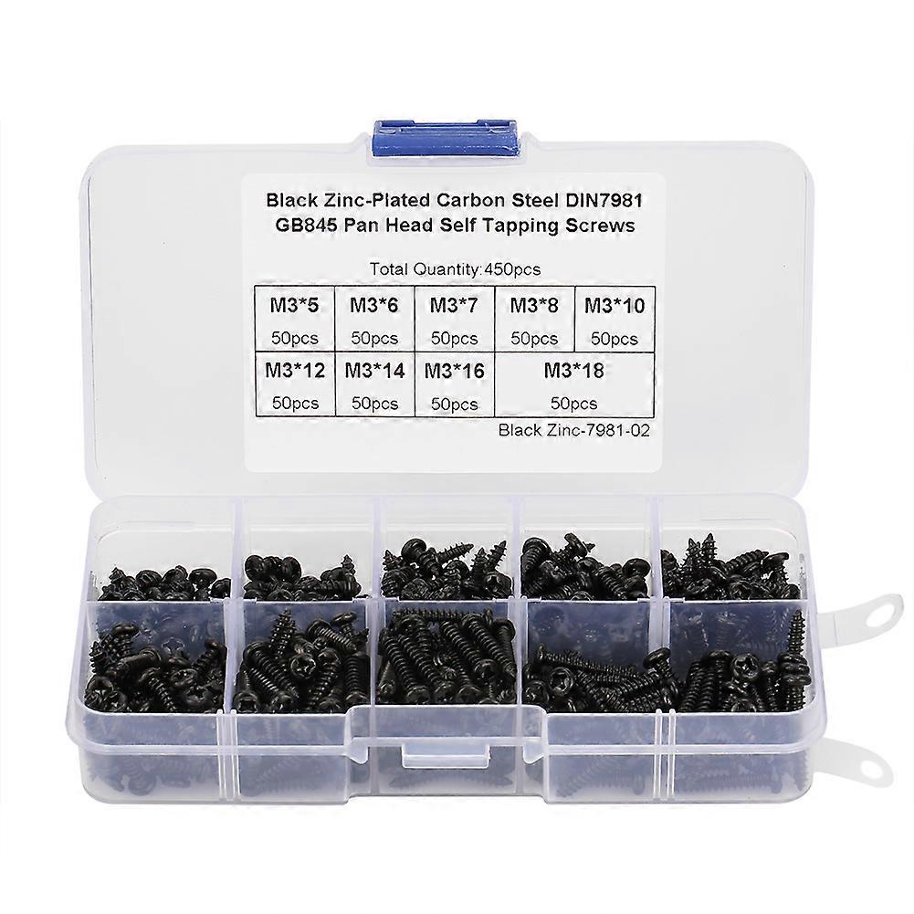 450Pcs Black M3 Cross Pan Head Self Tapping Screws Set Assortment Kit