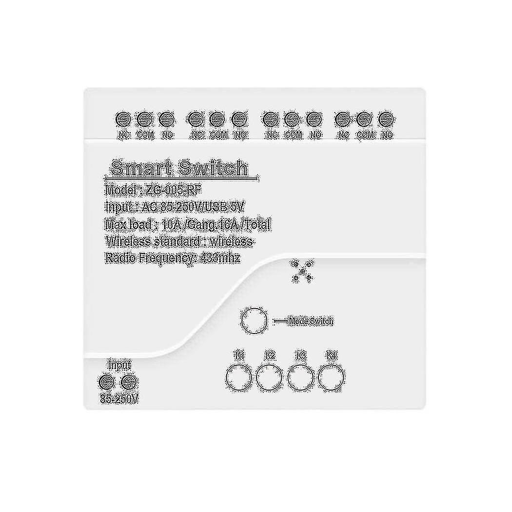 Product name: AC85-250V ZigBee wifi Smart switch [Independently control 4 devices]:It is the new 4-channel which can make you remotely turn on/off 4 independently. [3 powerful working modes ]: The switch is a -type/self-locking smart switchsupporting ZigBee. You can set self-locking, and inching modes to meet different needs. It can be used as a Zigbee router to help transmit ZigBee signals to a stable connection when using multiple Zigbee devices in your house. [Smart Scenes]:You can create smart scenes in order that one Tuya or Smart Life APP device can trigger on/off another one or gather multiple devices into one group and tap to run . Use for 1.Remotely give a pulse signal to turn on/off Lights, and other home appliance. 2.Remotely give a pulse signal to turn on/off Garage Door,Door Access 3.Remotely give a pulse signal to control DC Motor,AC Motor to Forward and Reverse lnput voltage: AC 85V~250V Max.Current:2200W/10A wireless Standard:Zigbee Control Channels: 4 Channels Model Number: ZigBee Switch Features: Voice control,Time switch,APP control Voice Control: Google Assistant, Amazon Time Type: Timer connected object: household applicacances DIY: , Home automation Function feature: App Remote Control Working temperature: -20~70 Type: smart switch State of Assembly:-to-Go Compatibility:All Compatible color:White Material:PC+ABS Package Contents: 1 x smart switch Only the above package content, other products are not included. Note: Light and different displays may cause the color of the item in the a little different from the real thing. The measurement allowed error is +/- 1-3cm.