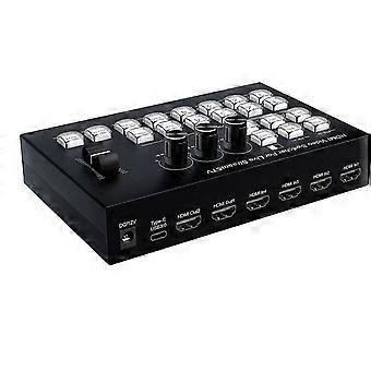 :New product ! new and high quality,buy with confidence!Video switcher for live streaming, 4 HDMI input support resolution 4K@30Hz, and support HDCP1.4 standard,support HD embedded audio +External analog audio, after mixed processing, can be embedded in the outputHD signal or output from the analog port. All resolution of the input signal is automatically adapted,the outputresolution is 1920X1080@60Hz, To satisfy the requirements of Radio and television program production,live production of interviews and speeches, outdoor experience events, school courseware production andother video switching needs. It can be used in live streaming and various event venues.Features:* 4 HDMI input; 2 HDMI output;* One Type-C 3.0 capture and push network traffic port, supports video format YUY2;* Support OSD display input channel signal, resolution information, volume information;* Support MIC,LINE IN,mixing output (LINE OUT fixed mixing output);* Support HD audio following (fixed following PGM);* Support left and right two segmentation (PGM on the left, PVW on the right);* Support LINE OUT and HD audio output;* Support power-off save Settings;* High quality keys, color backlight designSpecification:HD MI input resolution up to 4K@30HzHD MI output resolution 1080P@60HzType-C 3.0 capture and push network traffic video format YUY2,JPEGSupports audio format PCMThe maximum bandwidth transmission 148.5MHzMaximum transmission rate 1.65 x3GbpsThe input cable length 1080P60Hz15 m AWG26 HDMI standard cableThe output cable length 1080P60Hz15 m AWG26 HDMI standard cableMaximum working current 0.7 APower adapter specifications Input AC(50Hz,60Hz)100V-240V; Output: DC12V 2AWorking temperature range (-15 to +55)Size Approx. 180x115x52(mm)1: FTB -- PGM turns on or off to black screen2: PIP -- Enter or exit picture-in-picture mode(PGM background, PVW small image, audio follows PGM);3: SPLIT -- Left and right two segmentation (PGM on the left, PVW on the right);4: AFV -- audio follows PGM image;5: MIX -- Audio mix (MIC1-2Line inHD);6: MUTE -- Turn on or off the mute;7: PGM_1 -- PGM image switched to HD1; PGM_2 -- PGM image switched to HD2;PGM_3 -- PGM image switched to HD3; PGM_4 -- PGM image switched to HD4;BAR -- PGM blue image turn on or off;STILL -- PGM image is frozen or unfrozen;8: PVW_1 -- PVW image switched to HD1; PVW_2 -- PVW image switched to HD2;PVW_3 -- PVW image switched to HD3; PVW_4 -- PVW image switched to HD4;BAR -- PVW blue image turn on or off;STILL -- PVW image is frozen or unfrozen;9: Mic1 -- Tap MIC 1 to turn on or off the Input volume, rotate to adjust the volume.10: Mic2 -- Tap MIC 2 to turn on or off the Input volume, rotate to adjust the volume.11: Line In -- Tap to turn on or off analog audio input , rotate to adjust the volume;12: Slider key - Fade in and out between PVW and PGM image;13: Auto -- Fade in and out between PGM and PVW image;14: Cut -- Quick switch between PGM and PVW image;Package Content:1. Video switcher for live streaming 1PCS2. 1M Type-c USB3.0 to USB-A 3.0 cable 10Gpbs) 1PCS