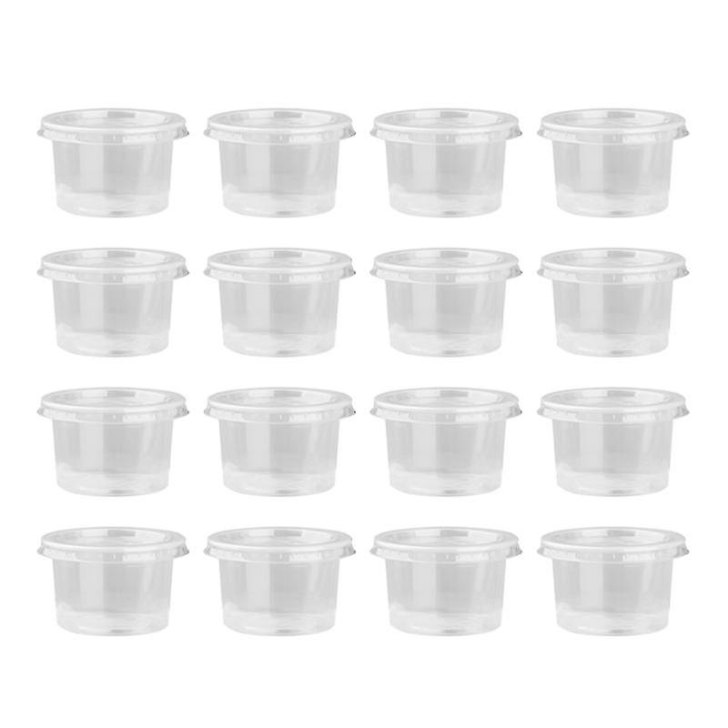 Features - Color: As shown. - Size: About 7.5x5.9x4.5cm - Material: PP. - Food grade material, safe for holding food. - With lids to keep the food from dust and dirt. - Use them as disposable containers or recycle cups. - Using them to hold jelly or some delicious souffl eacute; dessert, salad dressings, sauces, condiments, ice cream or chocolate mousse.