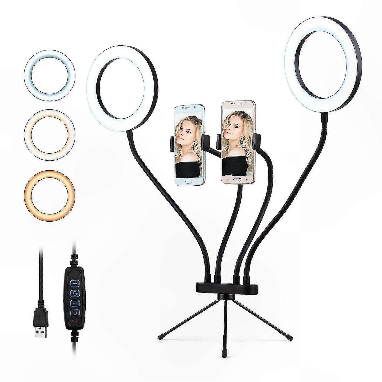 6" Dual LED Ring Light with Tripod Stand, 3 Color Modes, 10 Brightness Levels, Dual Phone Holders, Adjustable 3000-5000K