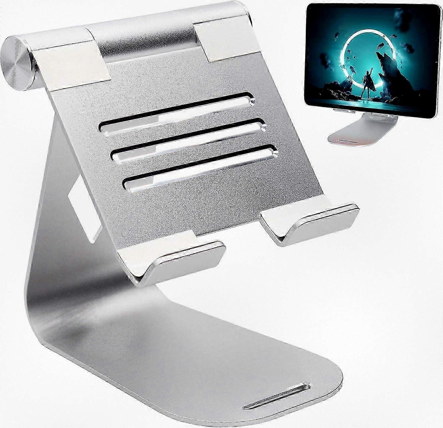 Heavy-duty aluminum alloy stand with strong, sturdy construction. Adjustable angle for comfortable viewing at your preferred position. Hands-free design allows watching movies, videos, or gaming while charging. Non-slip rubber pads prevent scratches and keep your tablet secure.