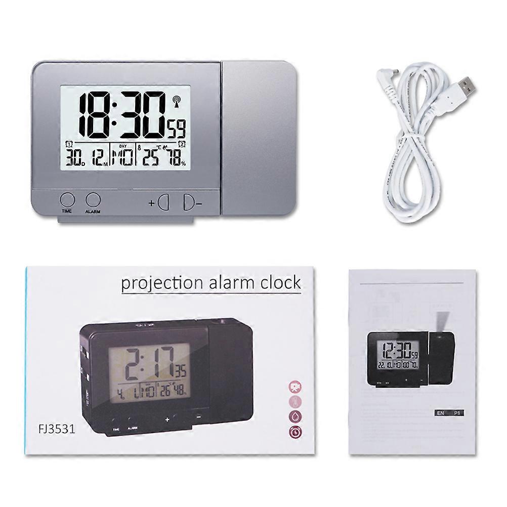 This is a Multi-function clock, not only a alarm clock, but also Time and temperature display, When the battery is charged or powered by USB cable, Double alarm function, slow rising, Projection and nearly 180 degrees free rotation (display time and temperature). Feature - Color: Silver - Material: Plastic. - Size: About 13.5x4x8.5cm. - Power supply: AAA*2PCS battery / 5. power supply - When the battery is charged or powered by USB cable - Time, date and week display ( : week in 7 languages) - Double alarm time and date/temperature and humidity can be switched to display - Projection and nearly 180 degrees free rotation (display time and temperature) - projection lamp: power supply: always on (when receives, it is synchronized with backlight) - Made by for use. Package list: 1 x clock
