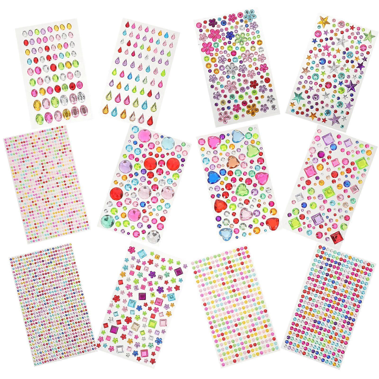Assorted Shapes Rhinestone Gems Stickers 12 Sheets For Craft Projects And Kids Makeup With Strong Adhesive