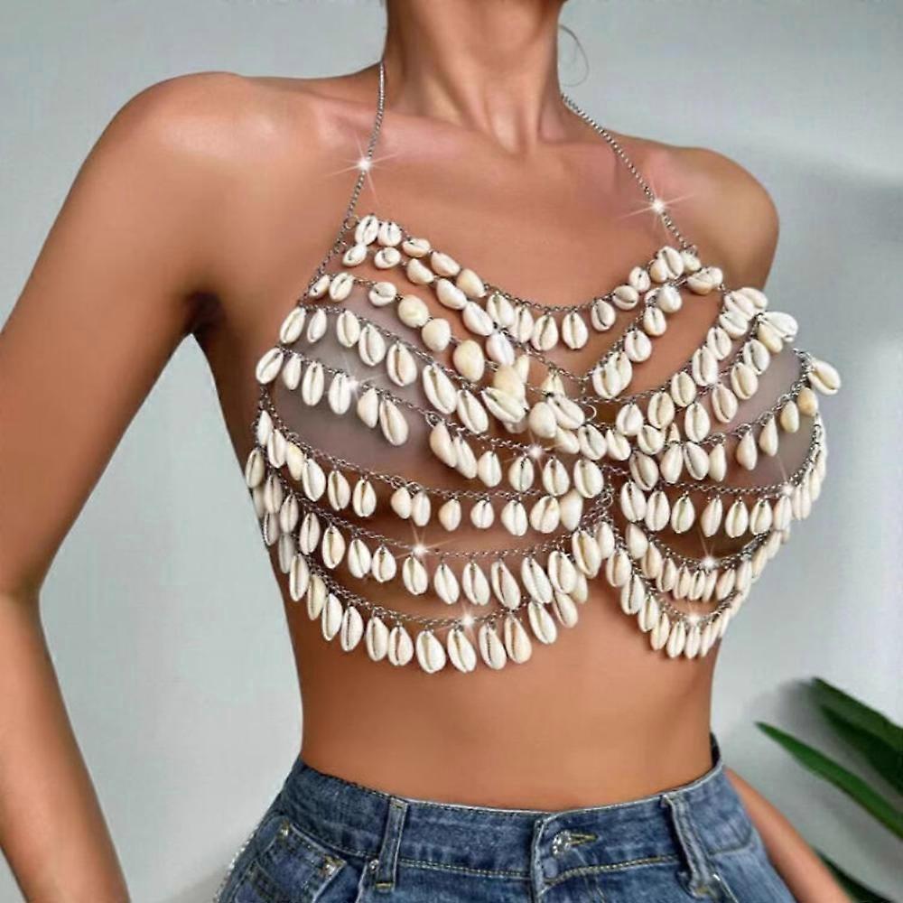 Beaded body chain, multi-layered brooch, festive body chain, handmade seashell belly button chain, perfect for beach parties, handmade chain top.