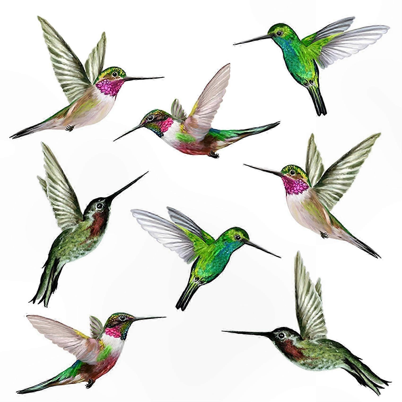 PREVENT BIRD STRIKES - Help prevent birds from flying into windows with these decorative hummingbird anti-collision window clings. INSIDE AND OUT - Each design is printed double-sided using an innovative printing process, enhancing the view from both inside and outside your windows. UNIQUE DESIGN - Each cling features a unique pattern and is slightly translucent to catch the light. Each piece measures approximately 16cm x 10cm. NO MESS APPLICATION - Static cling technology requires no adhesive—just a fine mist of water for application. Leaves no residue and allows for easy repositioning. Clings can be removed, reused, and repositioned multiple times without damaging windows. EASY TO USE - Step 1: Clean the window surface. Step 2: Lightly mist the glass with water. Step 3: Peel the hummingbird window cling from the backing and place it on the window in your desired arrangement. Reposition as needed. Color: Multicolor Material: PVC Package Contents: 2 sheets (4 per sheet) x Hummingbird Anti-Collision Window Clings Note: The package includes only the items listed above. Other products are not included. Note: Lighting and display settings may cause slight color variations between the image and the actual item. Measurement may vary by +/- 1-3cm.