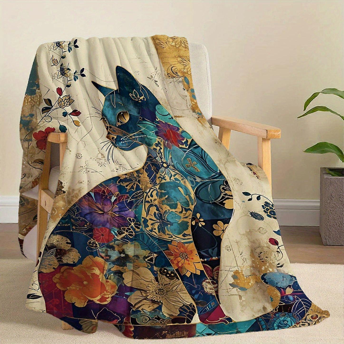 Bohemian Style Cat-Patterned Flannel Blanket - Soft, Lightweight, All-Season Polyester Bedding with Vibrant Floral and G-mnbvc433