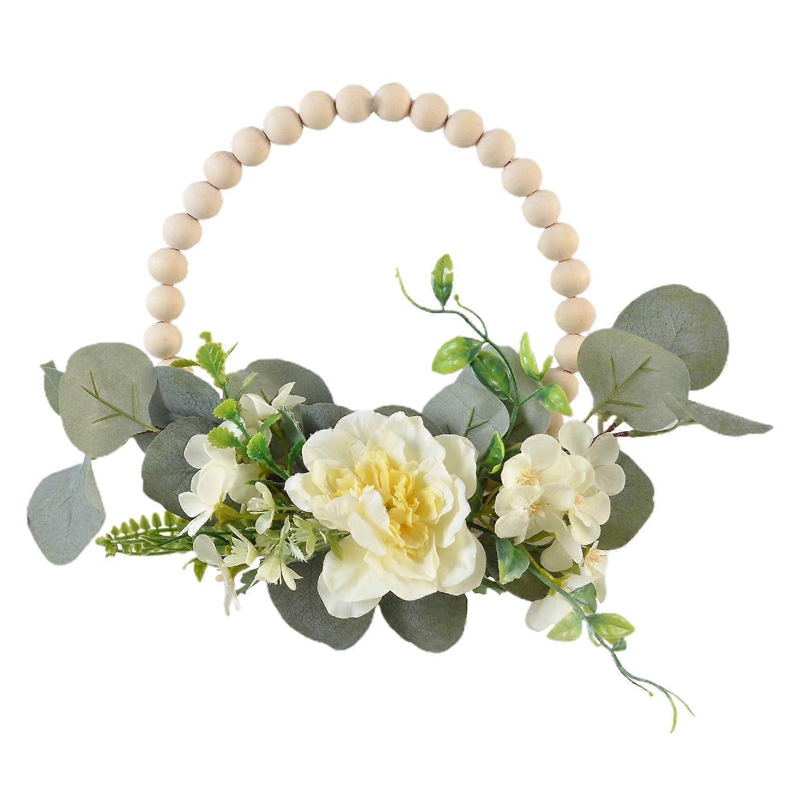 Boho Rustic Wood Bead Wreath with Flowers Front Door Garland Greenery indoor and