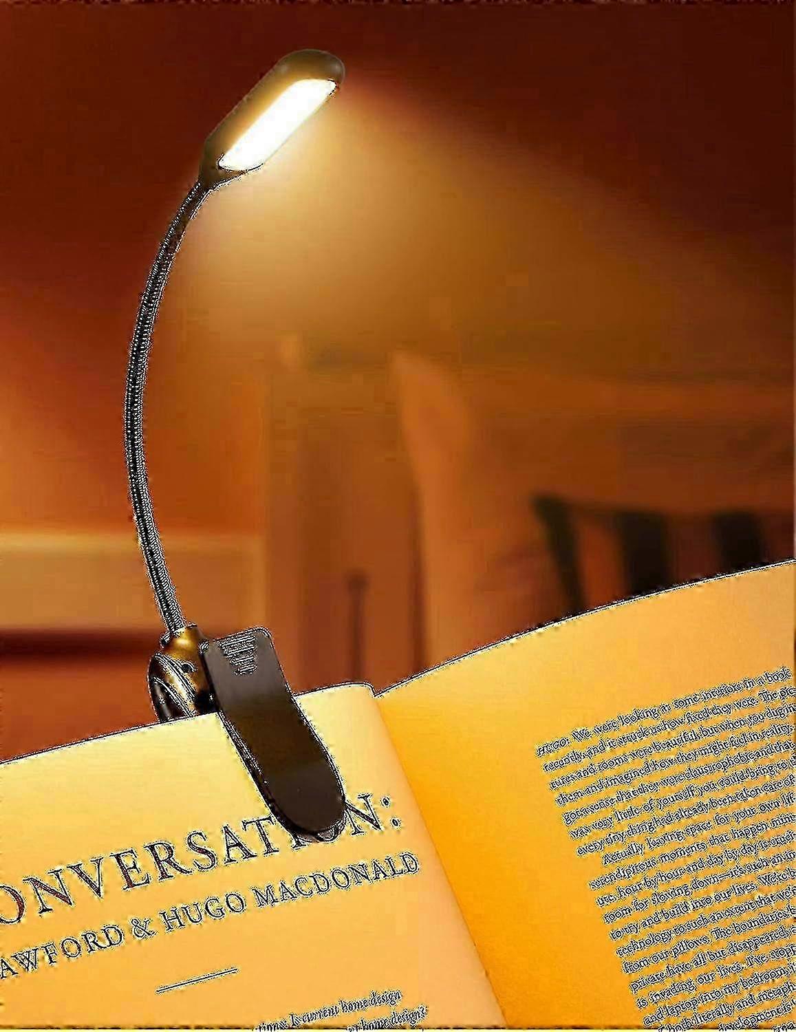 Usage Tips:Features:1. The book lights for reading at night have 3 colour temperatures and 3 brightness settings. The brightest setting easily lights up 2 full pages of any size book, and the lowest one creates a private reading space for you when your partner is sleeping next to you2.The rechargeable reading light provides 4 80 hours of even and eye-friendly light based on your brightness setting. In just 1.5 hours, you can fully charge the clip on book light with the included micro USB cable3.The clip on reading light is so lightweight that you will hardly feel the added weight when you clamp it on the book. The foldable design makes it take up very little space, just like a mouse, easy to pack for traveling4.The book reading light clip opens about 3 cm and offers secure grip for thin objects, which is very suitable for books, e-books, tablets, etc. The non-slip clip is padded with soft sponge to avoid leaving marks on your book and e-book cover5. Its gooseneck is flexible so you can position the light exactly where you need it. And it is covered with metal material, which increases durability and lifespan of the LED reading light and avoid the lamp head shaking during useSpecification:Product name: Book LightsBattery: 1000 mAh polymer batteryLamp beads: 14 LEDs (6 yellow and 8 white)Power: Max 2.8WColor temperature: 1600-6000KOutput: DC5V 1ASwitch mode: touch and three-color switchingLong press for infinite dimming and brightness limit promptPackage Included: 1X Book Lights1X USB