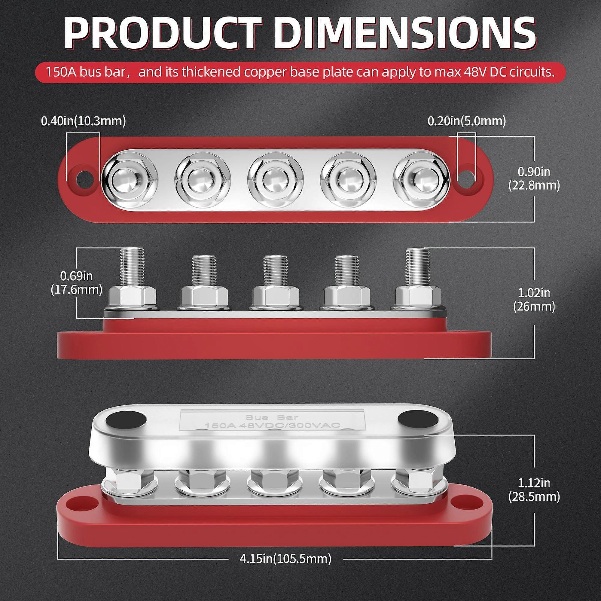 Bus Bar 12V Power Distribution Block with Cover 5 x 1/4" Studs Terminal Block Max 150A 48VDC Positive for Auto