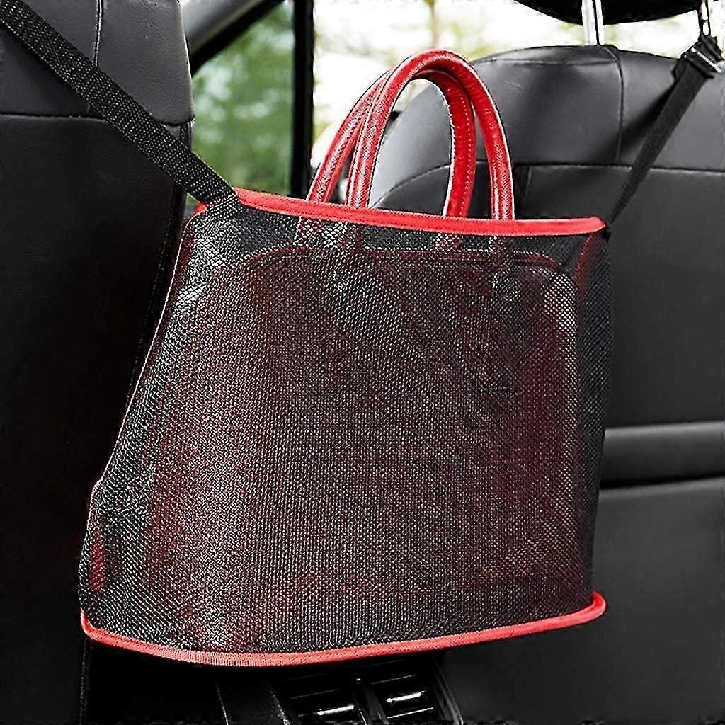 Car universal elasticated mesh trunk pocket tote for storing wallets, mobile phones, documents and a barrier for pets in the back seat.