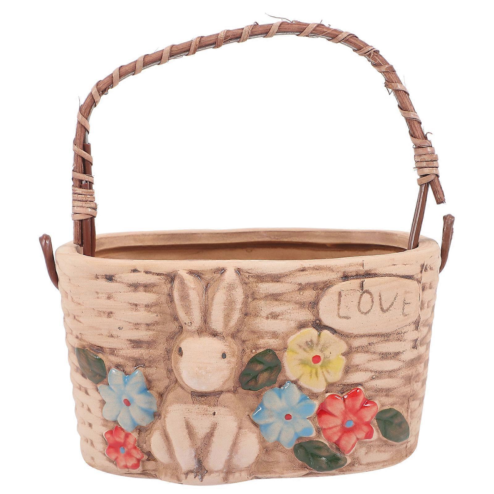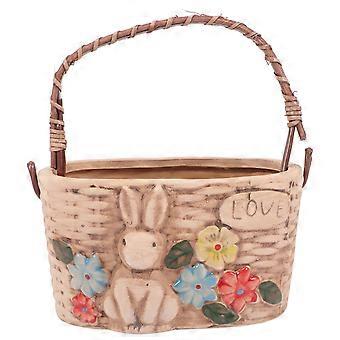 Ceramic Beige Bunny Planter Pot for Home Use with Portable Handle 6.5 Inches
