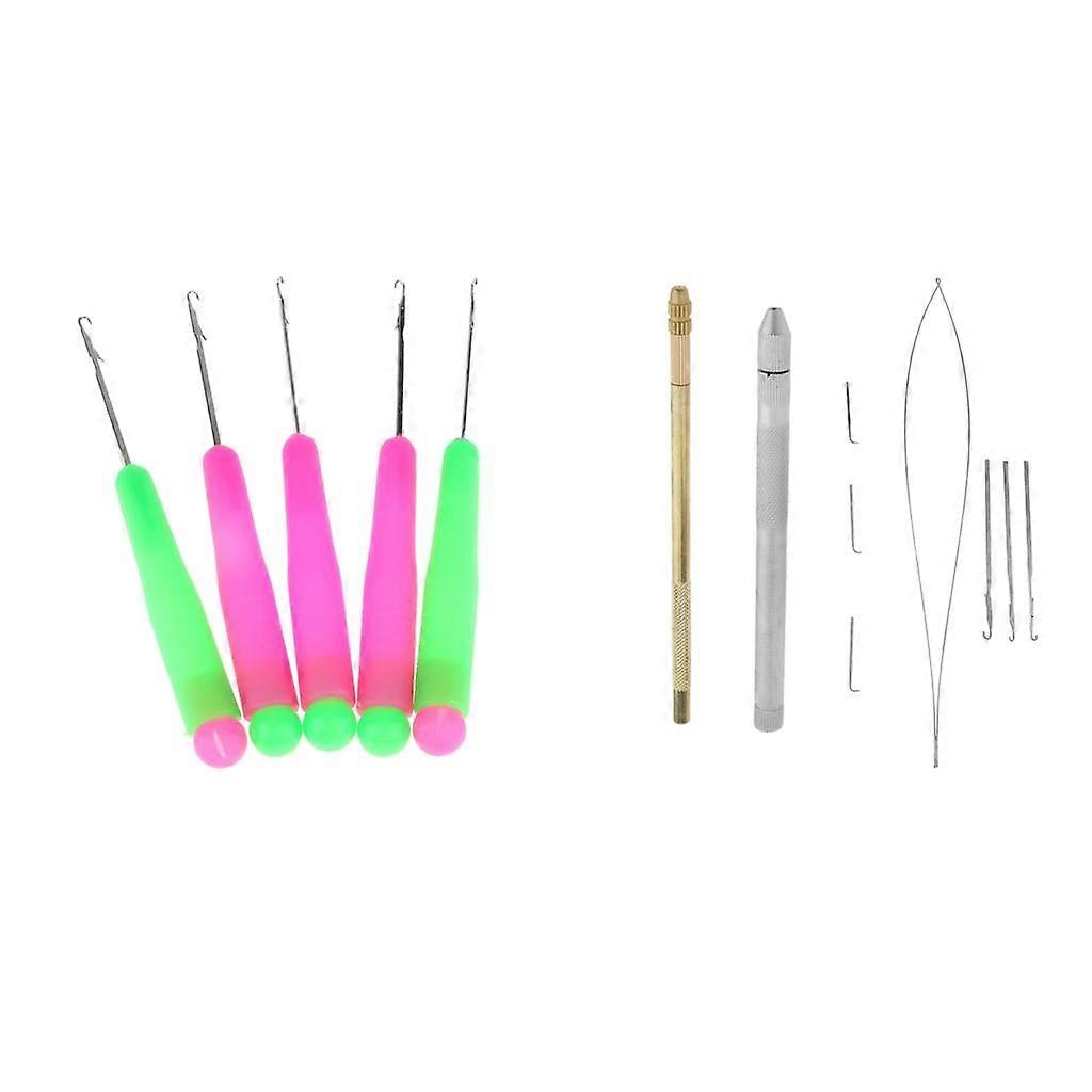 Description: Crochet Hooking Ventilating Latch Pulling Latch Hook Loop Needles Holder Set. Aluminum Ventilating Latch & Pulling Hook Needles and Holder Kit - 2 holder+3pcs needles+1 loop hook+3 crochet needles, with 5 pieces plastic handle latch hook. Repair Making Lace Wig Toupee Hairpiec and Beads Rings Threader. 5 Latch Hook Crochet for Micro Beads Hair Extensions Wig Lace Making and handmake manufacture rugs. Great For DIY Lace Wig, Dreadlocks, Sister lock, Micro Rings/Beads/Links, Starter and Maintenance and fast bead loading, string beads, hair extension and feather installation. Specification: Material: Aluminum, plastic Package Includes: 2x holder 1x loop hook 6x needles 5x latch hook tool