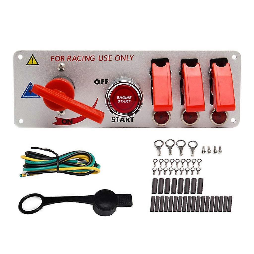 Description: Made of high quality aluminum alloy + plastic material,durable. Universal for 12V cars auto use. 1pcs start button and 3pcs toggle switches for additional use. .Fits for cars or vehicle DIY or other cars,also can be used as starting switch,storage battery switch,-flashing,etc. Size:Approx.195x67mm/7.68x2.64inch. Package Includes: 1Set Ignition Switch Panel