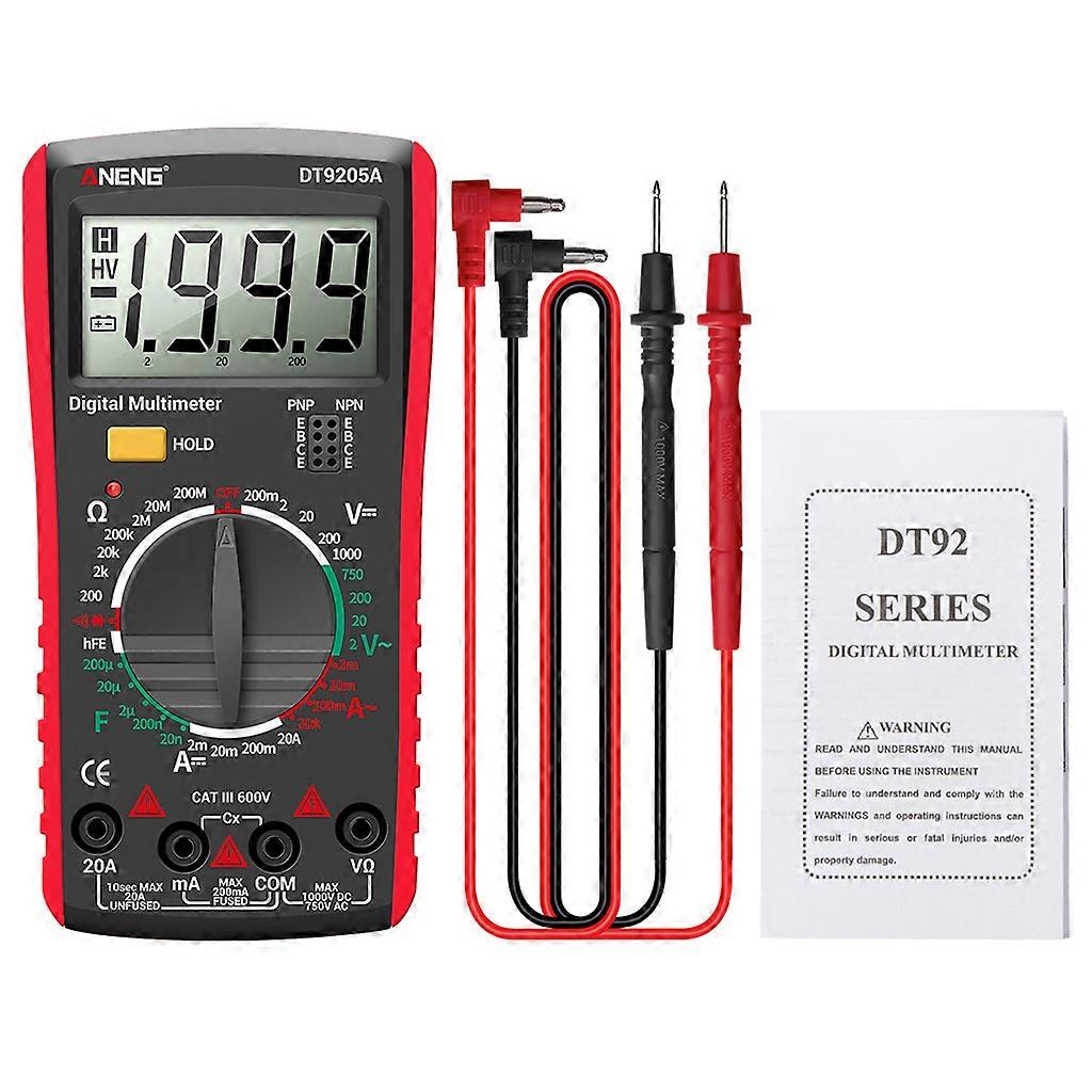 DT9205A hFE AC DC LCD Display Professional Electric Handheld Tester Meter Digital Multimeter Multimetro Ammeter Multitester Features: Angle adjustable Large screen, easy to read Full protection design against burn Data hold function for easy reading after measurement With PVC shockproof holster Specifications: AC Voltage: 2V-750V DC Voltage: 20mV-1000V DC Current: 2mA-20A AC Current:2mA-20A Resistance:200/2k/20M/200M capacitance: 2nF-2uF-200uF Triode: can measure the hFE parameters of NPN or PNP transistors (0-1000) Data retention: YES Diode: YES Battery Power: 9V*1 or AAA*2 (Random) Package included: 1 * DT9205A Multimeter 2 * Test Cable 1 * User Manual