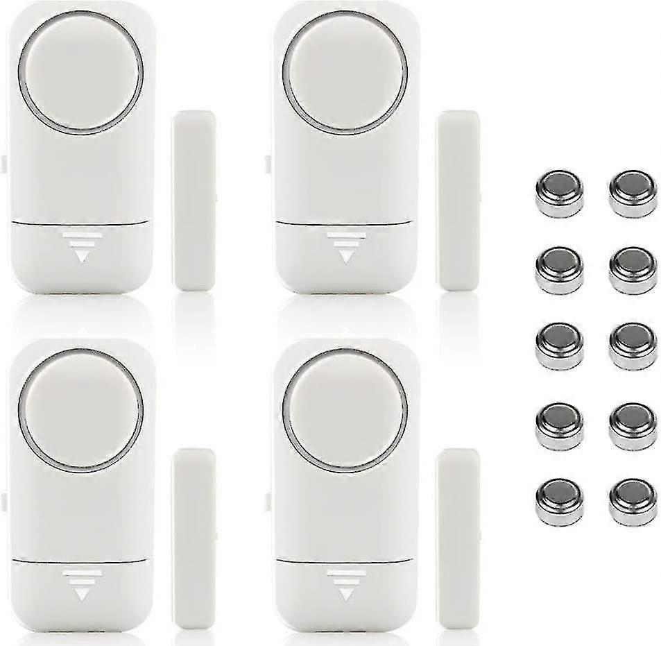 Security system for home with 120dB siren alarm, effective for anti-intrusion, anti-theft, suitable for home, office, hotel, apartments, garages, dorm room, RV. Keep kids safe by detecting entry, alerts when children open doors/windows, ideal for homes with swimming pools. Smart design: Size 6.4x4.25x1.7cm, ultra-slim, 3 adjustable settings (on/off/set). Magnetic wireless sensor triggered when door/window opens. Easy to install with double-sided adhesive tape, no wiring or screws needed, suitable for windows, doors, drawers, etc. Operates on 3 LR44 button cell batteries (included in each alarm); replace batteries when weak for better protection. Color: As shown. Package includes: 4 x Door and window alarms.