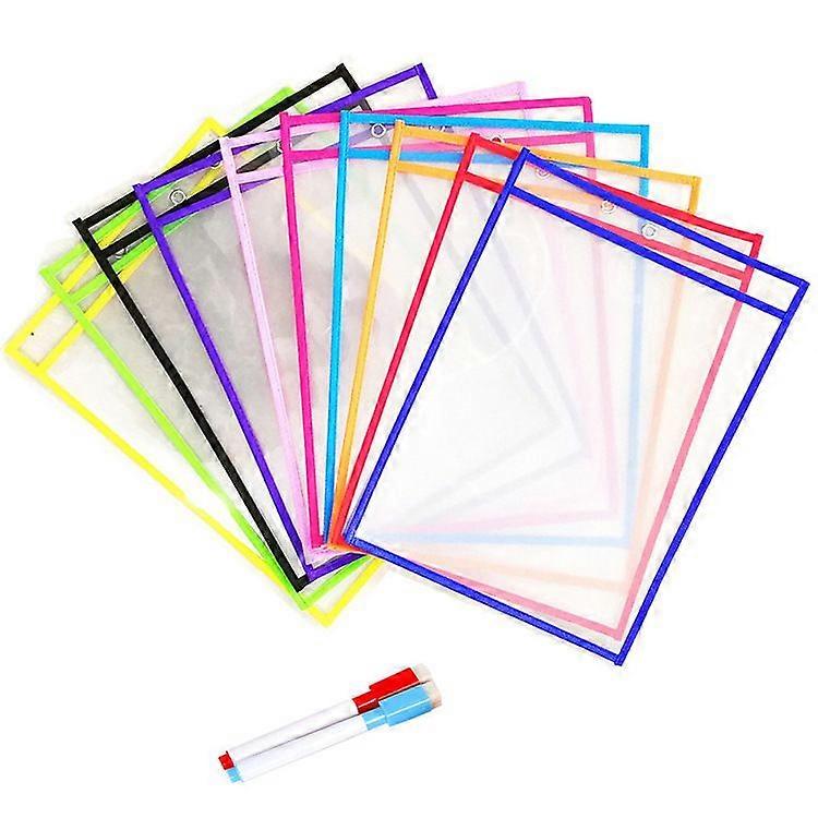 Dry Erase Pockets Set, 35 x 25cm Reusable Write and Wipe Clean Pockets with Bone Shape Eraser,10 Erase pens,for School Work Use Supplies(20pcs, random