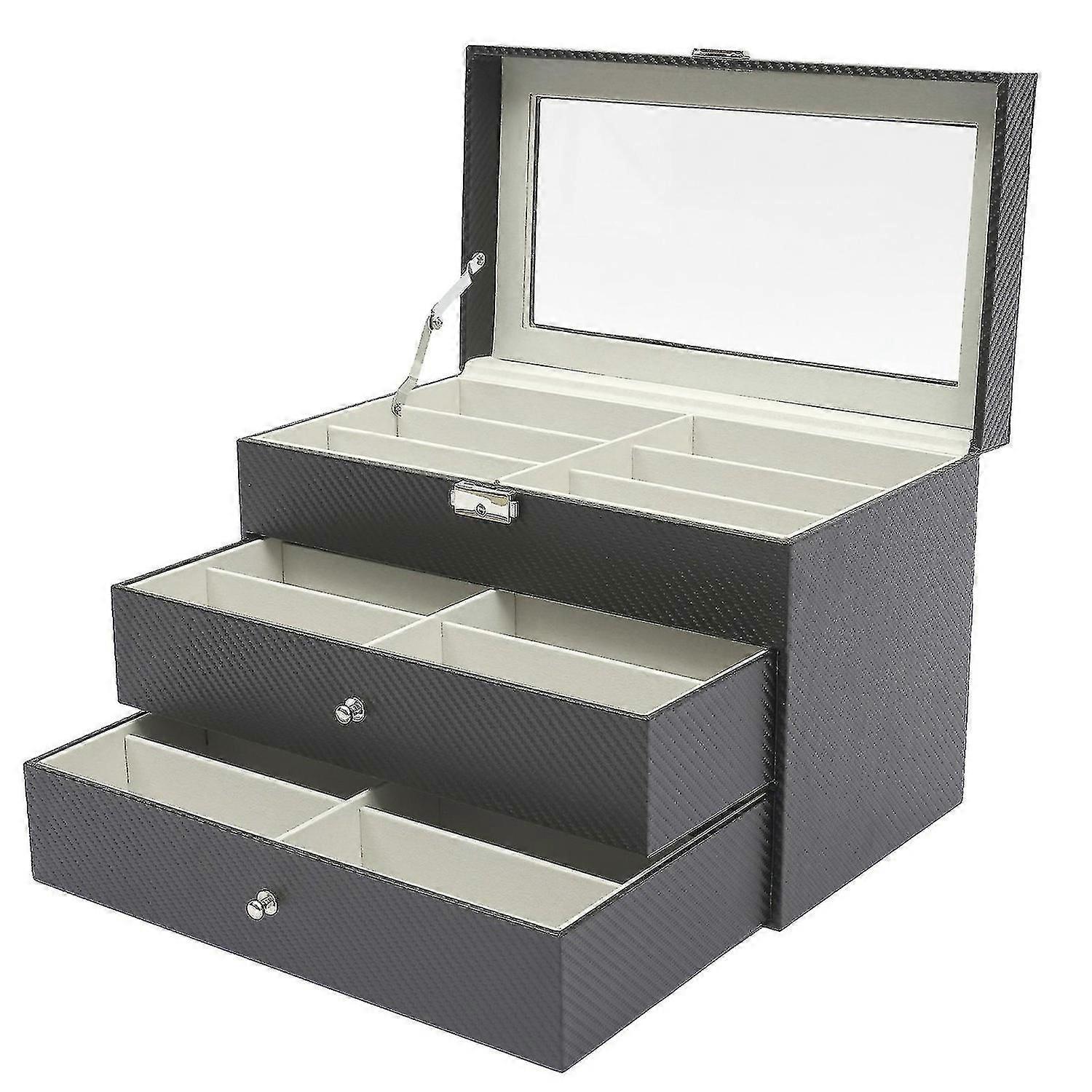 s: This sunglasses storage box is used to store sunglasses and eyeglasses. Drawer type, three-layer 18-grid design, convenient and practical to save space, helpful to keep the house clean Applications: counters, glasses, home, Christmas gift, etc. Characteristics: - Durable materials The box is made of density card, carbon fiber pu, metals and glass, which are stable and reliable to use - drawer type The three-layer design, with two drawers and a top storage box, can effectively save space - 18 separate grids Easy Layer Has 6-Part Grids That Conveniently Store Eyeglasses Separately - Top Glass Cover Design Simple And Beautiful, The Sunglasses Can Be Displayed Clearly, With Metal Bracket Design, Stable And Reliable - Lock design The lock design can effectively protect the glasses from being lost, safe and practical Package weight: 3.08 kg Pack size (L X W X H): 35 X 21 X 24.5 cm Package: 1 X sunglasses storage box