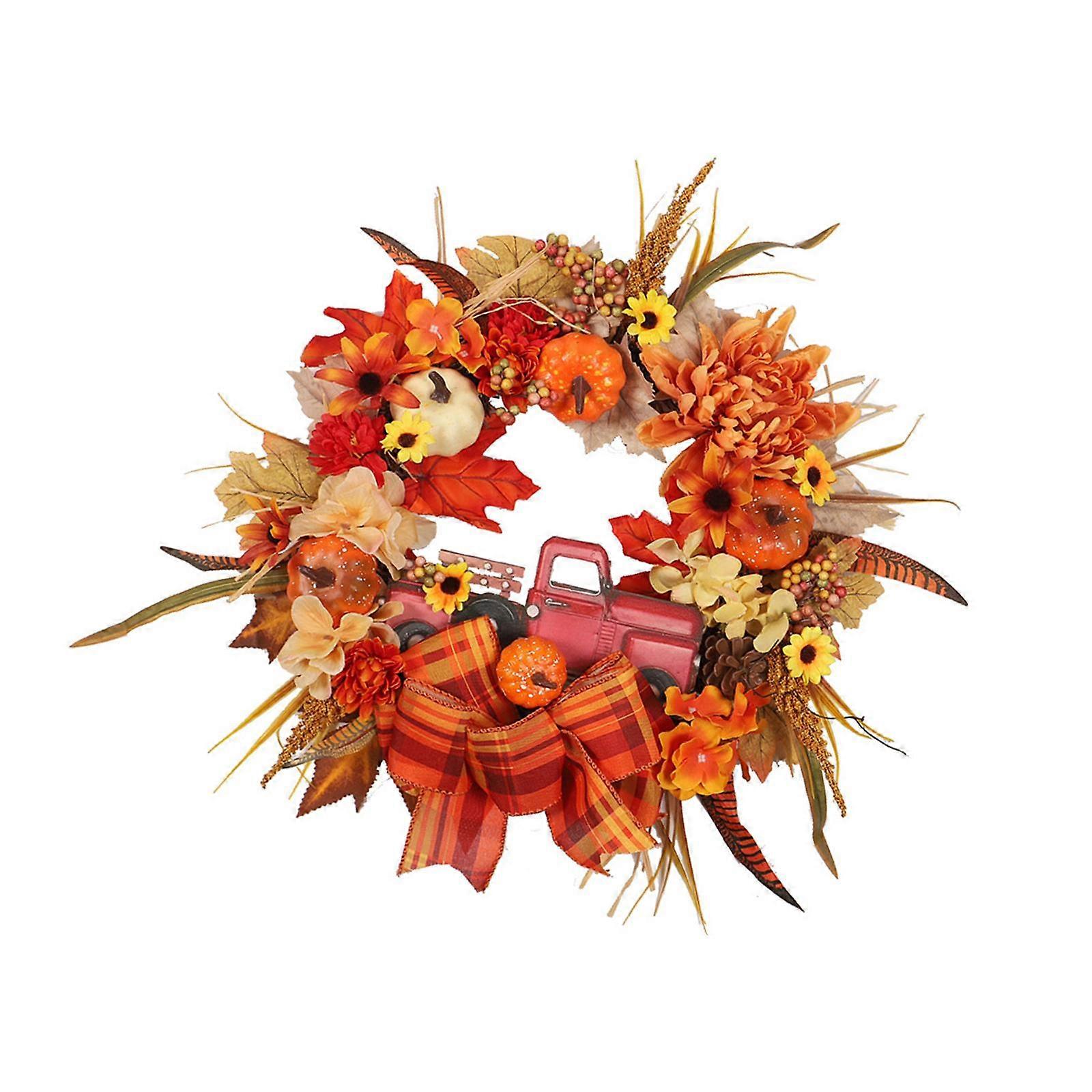 Description: Premium Material: The artificial wreath is made of premium PVC, foam and wood material, is lightweight, never withers and falls, beautiful and realistic.Fall Ornament: Handmade maple leaf fall wreath, decorated with mini foam pumpkins, artificial flowers, bow and truck wood sign, a great autumn festival celebration decoration, adds a warm harvest atmosphere.Front Door Decoration: The Thanksgiving wreath is a great hanging ornament to make your front door a beautiful and attractive entryway, welcoming your families and friends.Wide Applications: The autumn wreath is suitable for decorating the front door, wall, window, home, office, farmhouse, indoors and outdoors, etc. Great for Thanksgiving, Halloween and other festival decorations.Nice Gift: This harvest wreath is a great gift for your friends and family, a nice addition home decoration theme. Specification: Material: PVC foam wood Size Chart: Diameter: 45cm/17.72inch Package Includes: 1 Fall Wreath Note: Handmade products may vary slightly from batch to batch