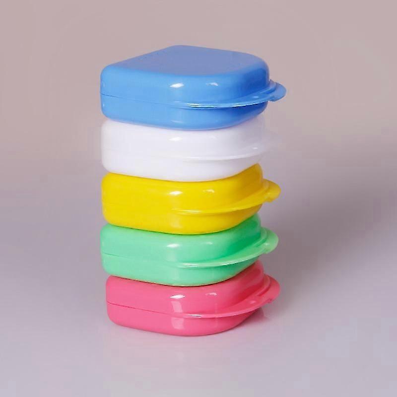 Retainer box with ventilation hole Orthodontic dental retainer box Denture storage box Bracket storage box 5pcs Product DescriptionMaterial: PPS Colour: 1 each of pink + yellow + blue + cyan + white Quantity: 5*Denture Storage Boxes 1. Keeps your mouthguard, retainer or dentures clean. The case inhibits the growth of bacteria during storage. 2. The integrated ventilation system keeps your mouth applicator dry and free from collection of decorations. 3. The snap-on case has a waterproof closure and a secure catch so you know your case won't pop open accidentally. 4. Sturdy and durable plastic won't break or fracture.