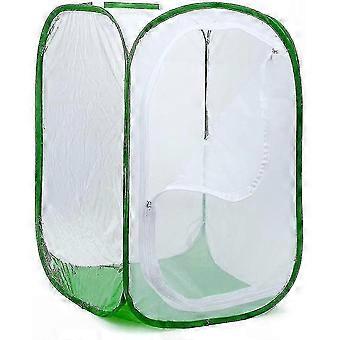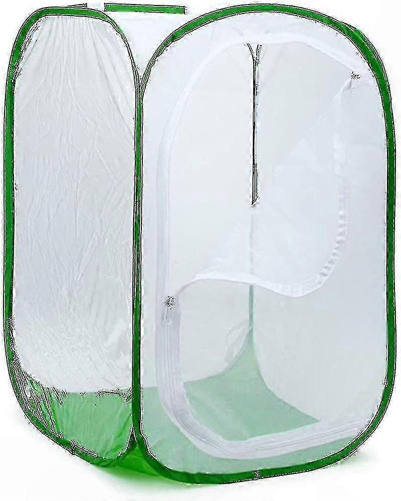 Size: 40X40X60CM Material: Polyester mesh fabric and steel wire Package Included: 1 * Pet Cage 1. MULTIFUNCTIONAL CATERPILLAR HABITAT This butterfly habitat is designed for raising butterflies and protecting butterfly eggs, caterpillars, and pupae from birds, wasps, and other predators. You can place a plant inside to create a more natural environment for the caterpillars. 2. WINDOW VIEWING DESIGN The pop-up butterfly cage features vinyl window panels that provide excellent visibility and help protect the habitat from strong winds. The clear windows allow children to observe caterpillar behavior, including eating and growth, supporting hands-on learning about nature. A zippered door allows easy access for adding or removing potted plants. 3. EASY TO CLEAN AND STORE Remove any plants, caterpillars, or pupae before cleaning. Gently sweep the interior with a small broom and dustpan, then wipe the base with a damp cloth. Hand washing is recommended. The cage folds flat for convenient storage when not in use. 4. EDUCATIONAL AND ENJOYABLE This butterfly house provides an engaging way for students and families to observe the full life cycle of butterflies—from caterpillar to pupa and finally to adult butterflies such as monarchs, painted ladies, or black swallowtails. Encourage children to explore nature and learn through observation. 5. OPTIMIZED AIRFLOW Mesh panels ensure proper air circulation while maintaining a secure environment. The fine mesh is soft and breathable, keeping caterpillars safe and comfortable throughout their development.