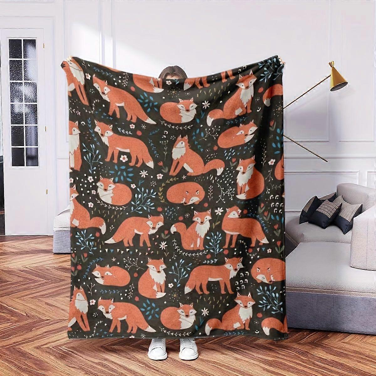 Fox Print Flannel Blanket - Soft & Warm All-Season Throw with Playful Fox & Floral Pattern, Vibrant Orange/White on Dark-PLKJD275