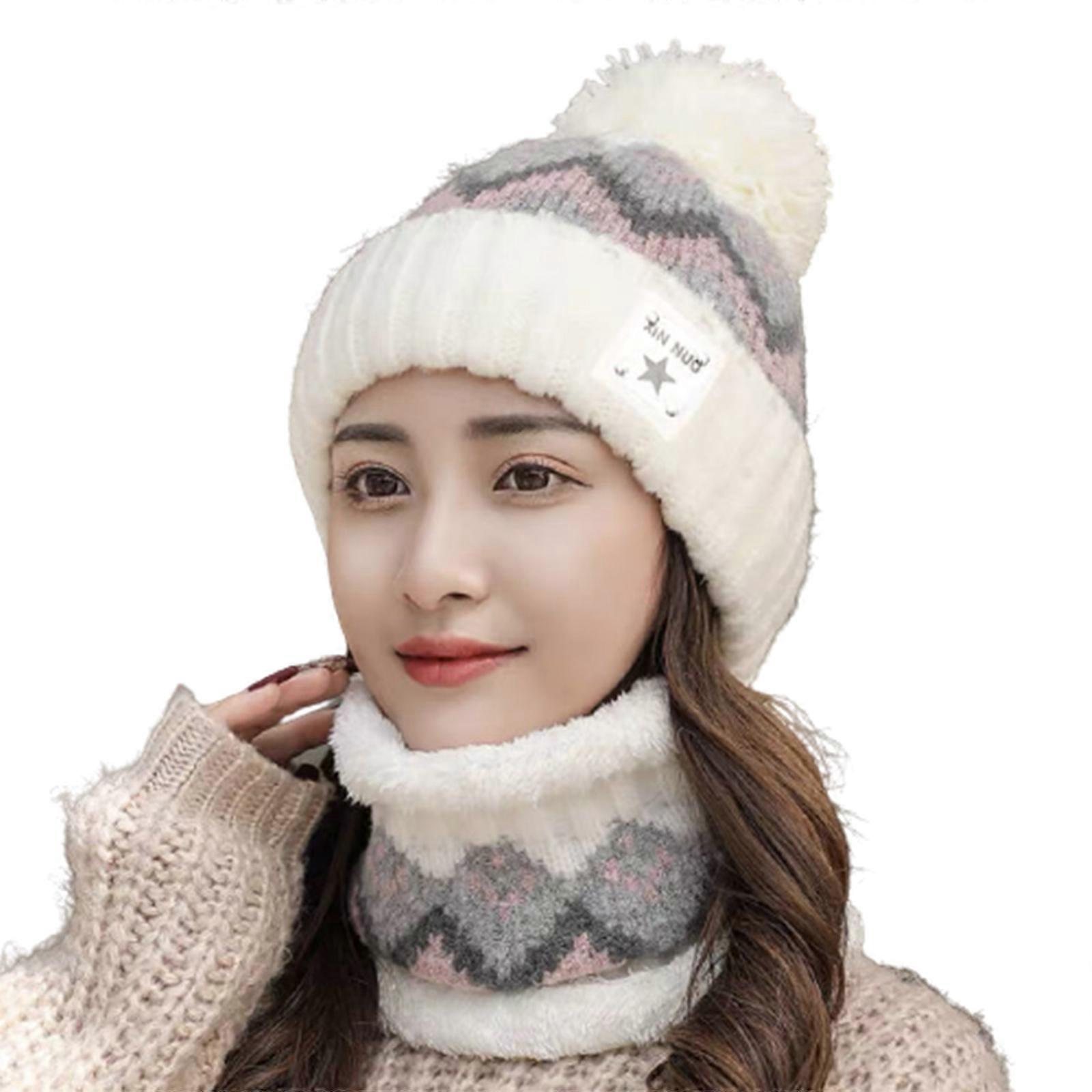 Girls Hats and Bib Knit Hats and Soft Scarf Set Unisex Windproof Hats Loose Hats with Fluffy Balls Soft Hats in Winter White
