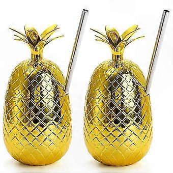Gold Pine Cups with Straws, 450ml, Set of 2, Perfect for Tropical Parties and Summer Gatherings