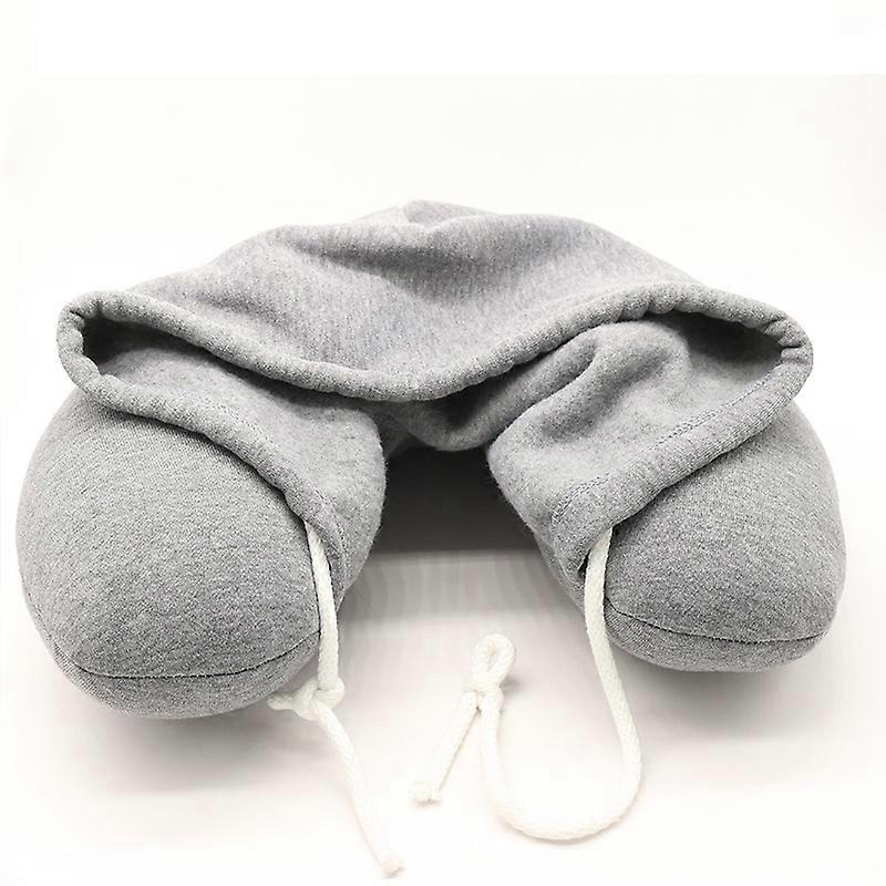 Grey Portable U Shaped Neck Pillow With Drawstring Hood - Grey