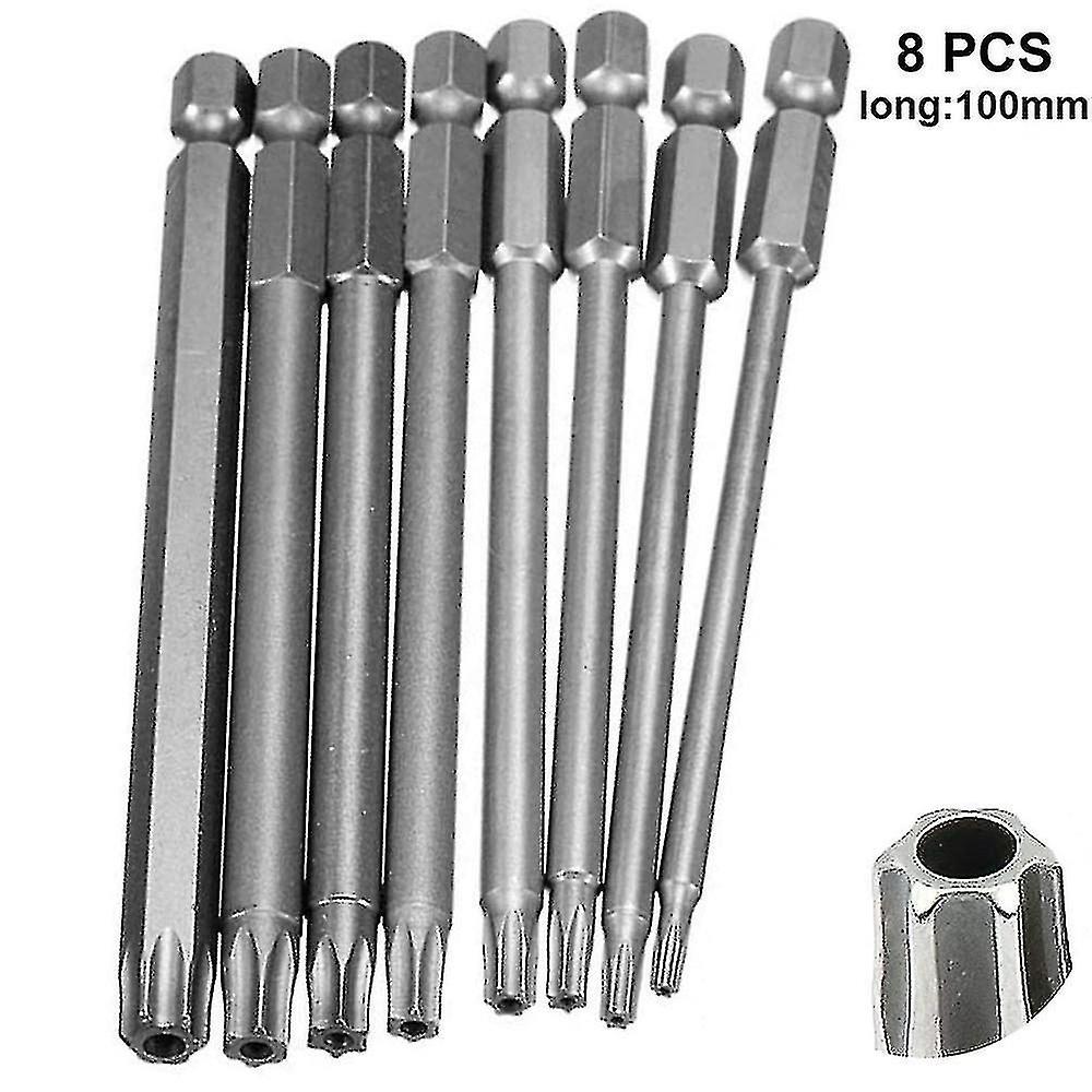 Product descriptionMaterial: chrome vanadium alloy steelSize: 100mm (8pcs), 150mm (8pcs), 100mm (10pcs)Whether it's magnetic: yesPackage content: 1 set of hollow plum bits with hexagonal handle1.High QualityMagnetizable Torx head screwdriver bits are made of excellent industrial grade S2 steel material for superior hardness that reduce wear-outs and ensure longevity, which is stronger and more durable than others.2.Strong Magnetic& High PrecisionMagnetizable Torx head screwdriver bits can be easily keep screws stuck to them,can improve your work efficiency; Each edge of the torx bit can be accurately locked screws, no damage to the screw and the screwdriver head.3.Professional Size8/10pcs torx screwdriver bit set can be used with any 1/4" hex shank electric screwdriver, manual screwdriver, electric drills, group general tools, etc.4.Wide ApplicationsTorx Bits are prefect for repairing automobiles, motorcycles, and bicycle brake systems (disc brakes), hard disk drives, computer systems and consumer electronics. It will be very convenient and necessary for your daily life.5.Exquisite WorkmanshipThis torx security tamper proof star bit set, exquisite workmanship, each edge can be accurately locked screws, no damage to the screw, and the screwdriver head.Such a practical aid in many situations.